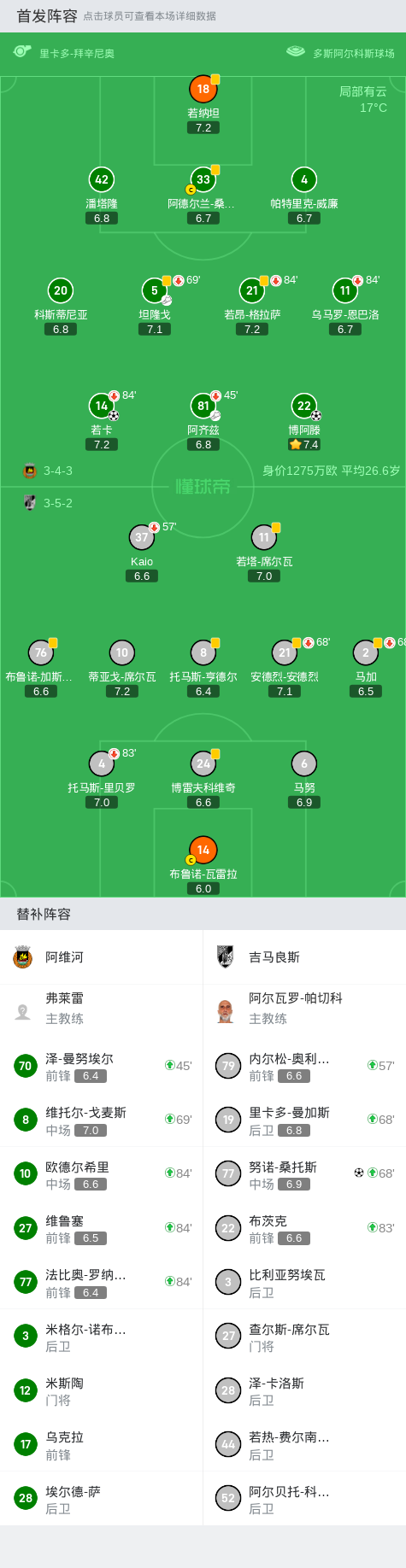 替换下场:84分钟21-若昂-格拉萨, 84分钟14-若卡, 45分钟81-阿齐兹, 84分钟11-乌马罗-恩巴洛, 69分钟5-坦隆戈