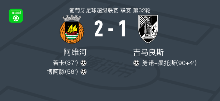 在葡萄牙足球超级联赛第32轮比赛中,阿维河队主场迎战吉马良斯队。若卡和博阿滕分别为阿维河队攻入一球,而吉马良斯队的努诺-桑托斯也有一次得分。最终比分为阿维河2-1吉马良斯,阿维河队获得胜利。