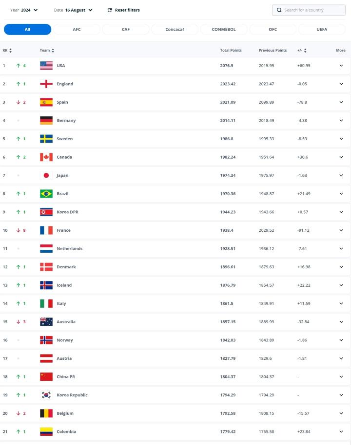 扫描下载懂球帝首页>动态> FIFA最新女足排名:中国女足上升1位,排在世界第18,亚洲第4