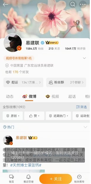 懂球帝首页>动态> 易建联微博短暂开启一键防护模式,现已关闭该模式
