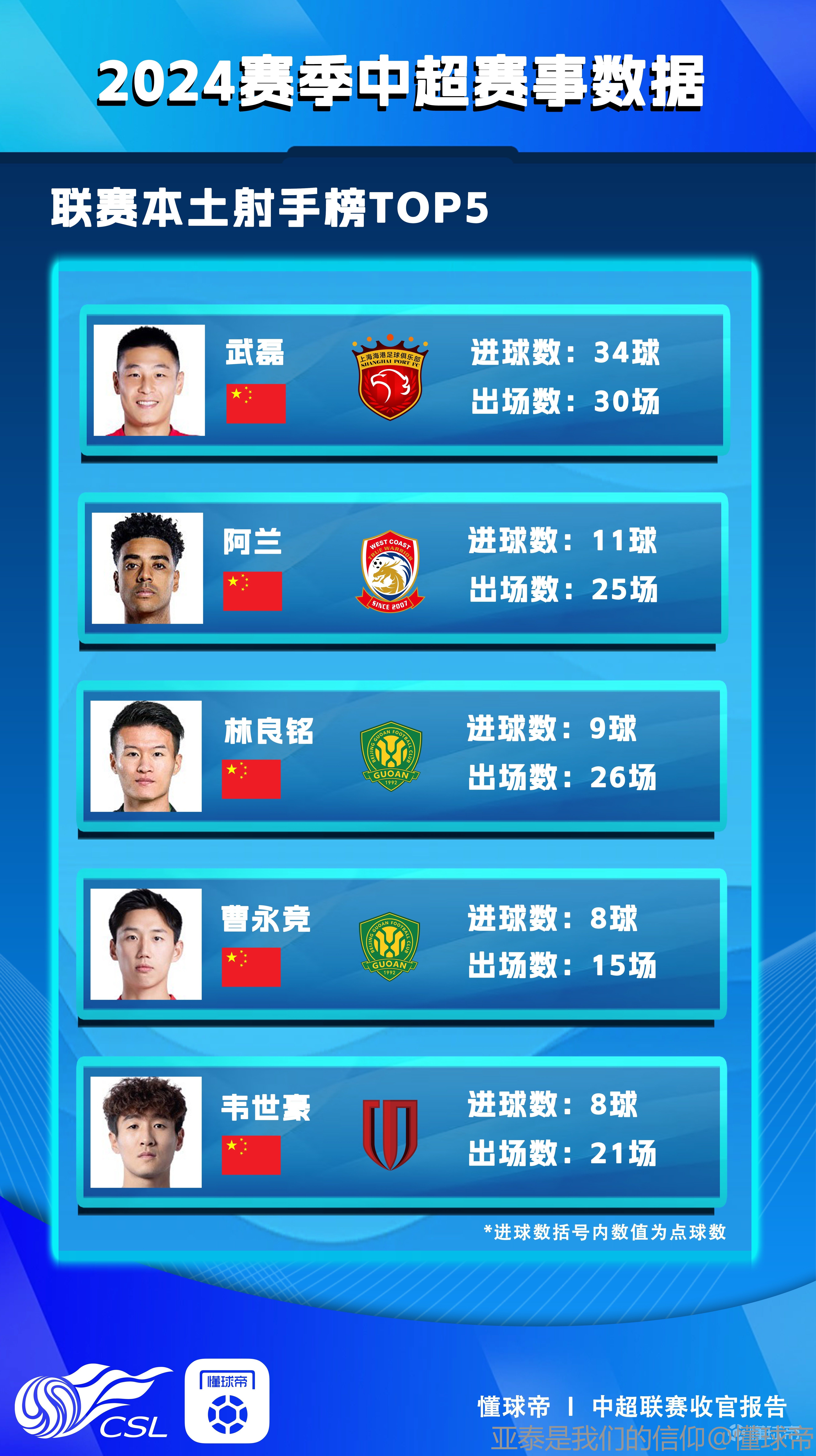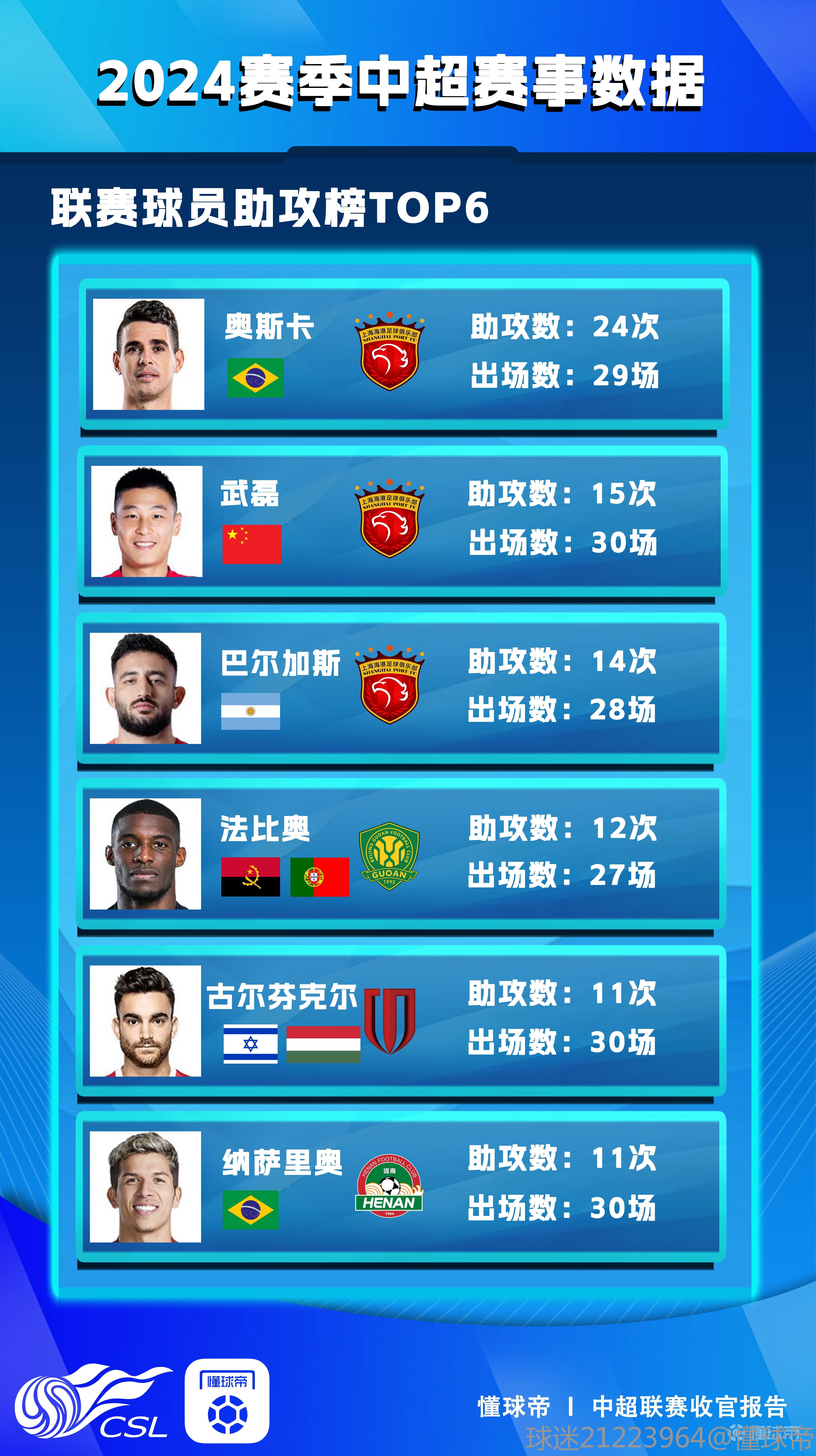 懂球帝《2024赛季中超收官报告》已经正式上线,今天将为您带来的是数据专题,让我们看看中超的各种“王”。