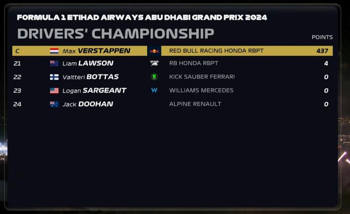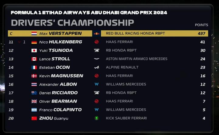 扫描下载懂球帝首页>动态> F1 2024赛季车手积分榜:维斯塔潘冠军,诺里斯P2,周冠宇P20