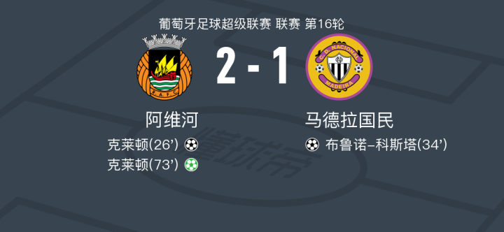 懂球帝首页>动态> 阿维河2-1马德拉国民,克莱顿独中两元