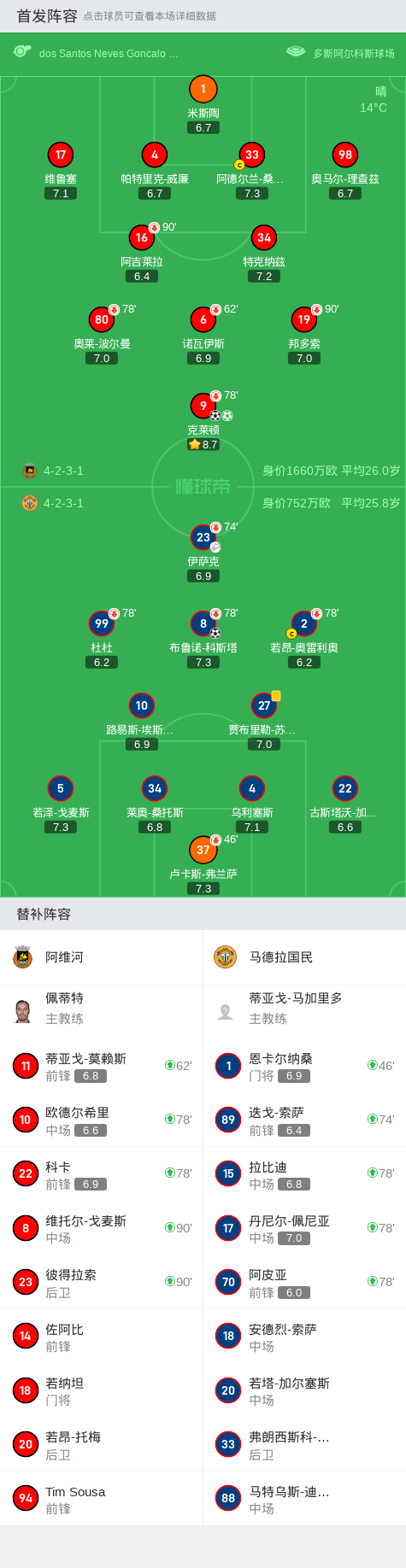 在葡萄牙足球超级联赛第16轮的较量中,阿维河坐镇主场迎战马德拉国民。比赛中,阿维河的克莱顿表现出色,成功打入两球,展现了强大的进攻能力。马德拉国民方面,布鲁诺-科斯塔在伊萨克的助攻下也取得了一次进球。最终,阿维河以2比1的比分战胜了马德拉国民,取得了本场比赛的胜利。