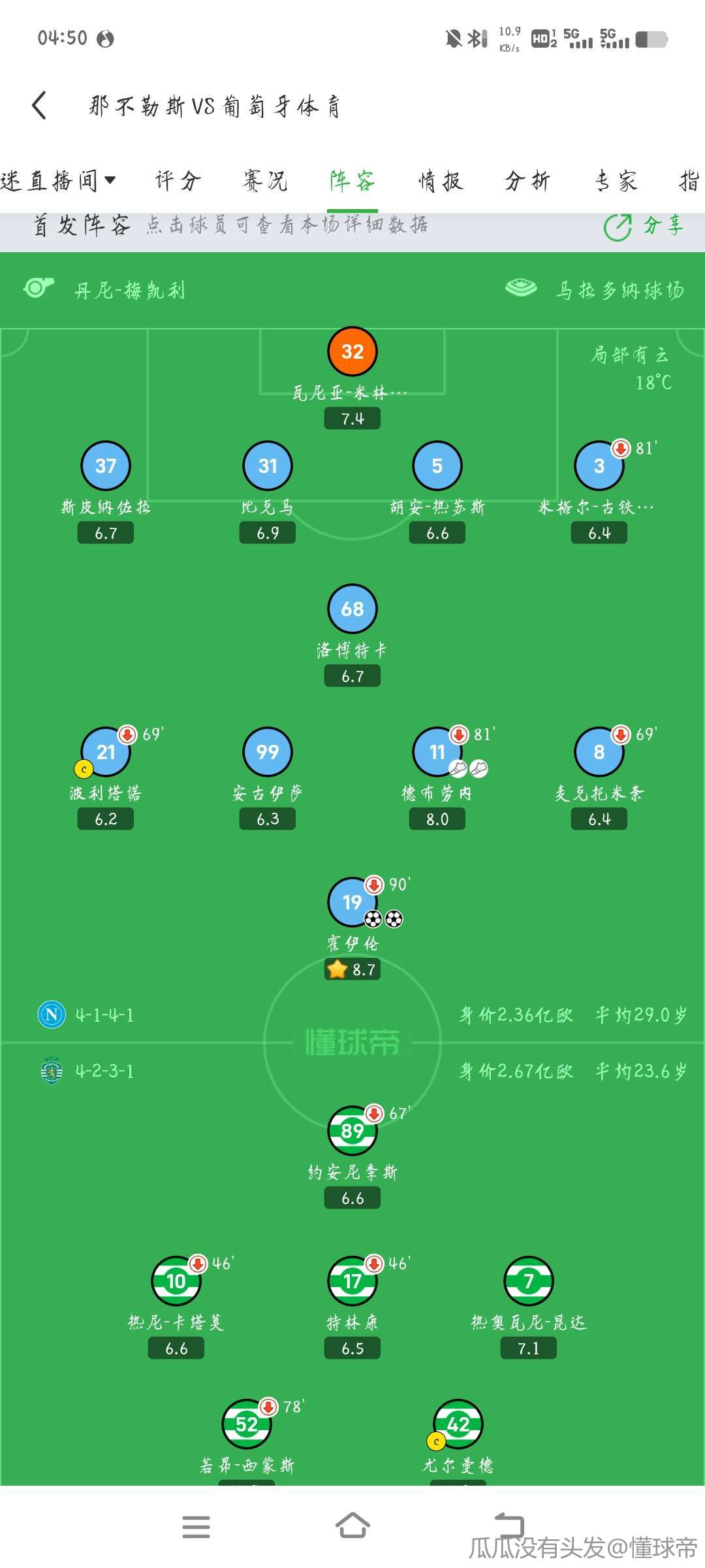 梅开二度,霍伊伦当选那不勒斯vs葡体全场最佳球员