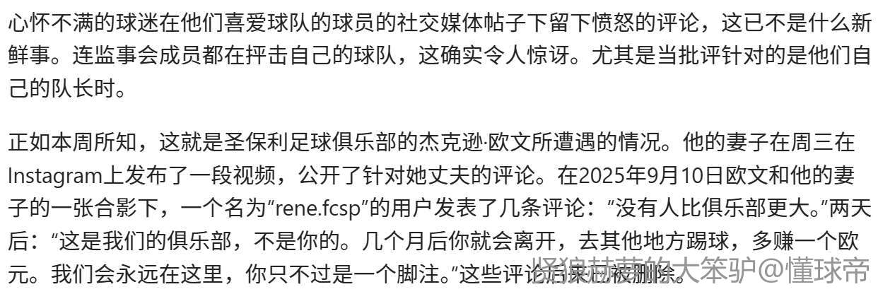 博恩还进一步讽刺欧文:“这是我们的俱乐部,不是你的。你很快就会为了多一欧元的优待离开,我们才会一直在这里,而你最终只会沦为历史注脚。”更令人意外的是,博恩并未使用小号,而是直接用带有自己姓名和圣保利官方身份后缀的账号发表评论。