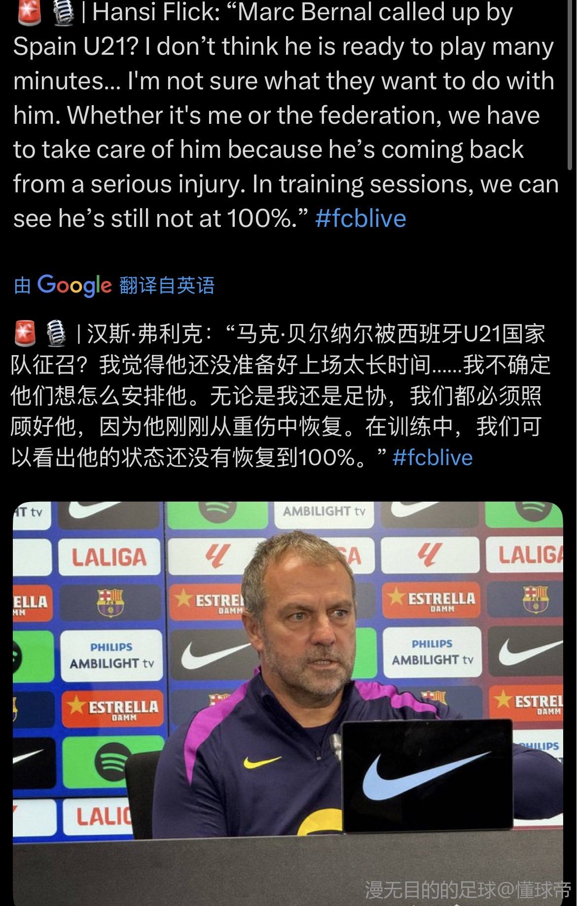 纯纯故意的,新闻说他原定于今日上午被U21国家队征召,巴萨的医疗报告昨晚送过去的…而且还是在巴萨对阵塞维利亚的赛前新闻发布会上弗利克发表言论后,贝尔纳尔的征召被撤销。因为这位巴萨主帅曾请求足协关注这名球员,他认为贝尔纳尔不具备踢太多时间的身体条件。
