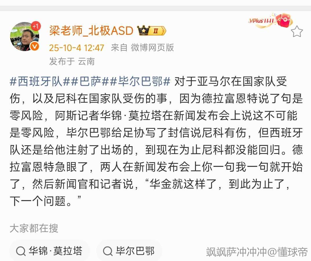 没天理了,九月份国家队比赛周亚马尔生龙活虎的去国家队报道两场比赛都踢了,期间还打了止疼药。回到俱乐部因伤休战一直缺席,好不容易踢巴黎复出了(这里解释一下上周联赛也出场了,踢了一会儿找了找比赛状态),然后旧伤复发,这不是一个很正常的过程?怎么现在成了亚马尔诈伤了?近一个月亚马尔一直缺席的是俱乐部比赛。又不是一直踢俱乐部比赛,到国家队比赛了,突然伤的。