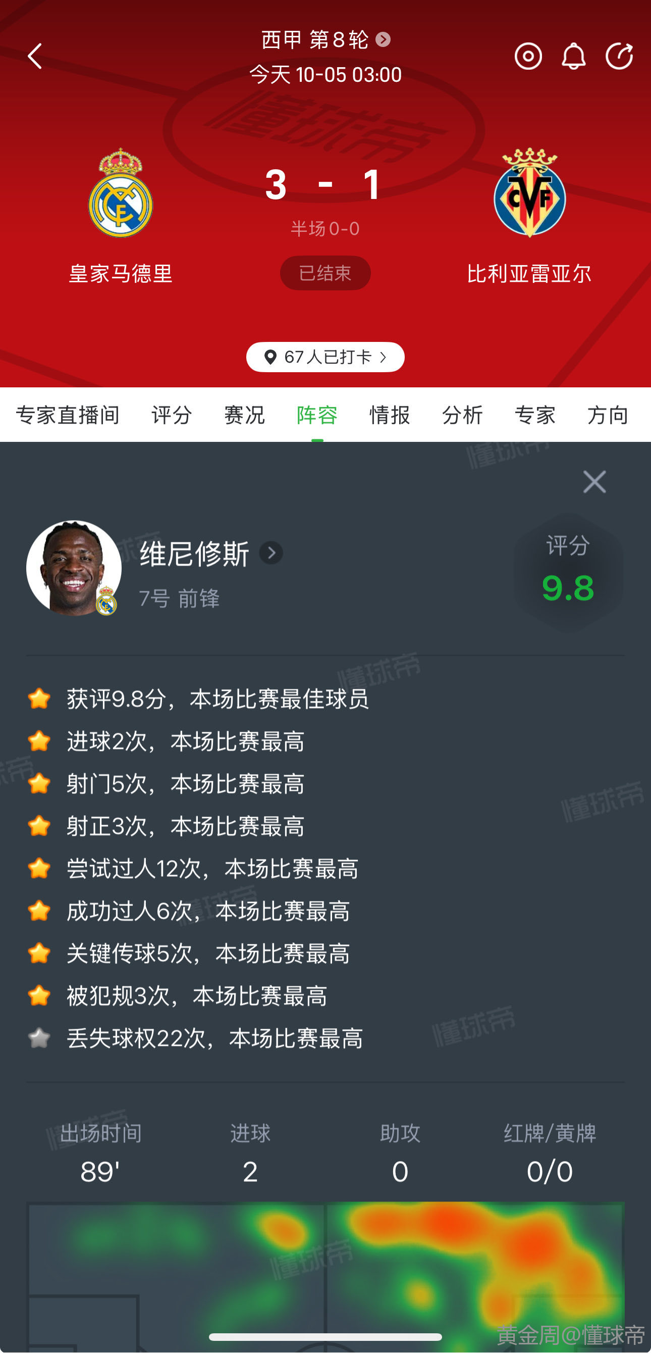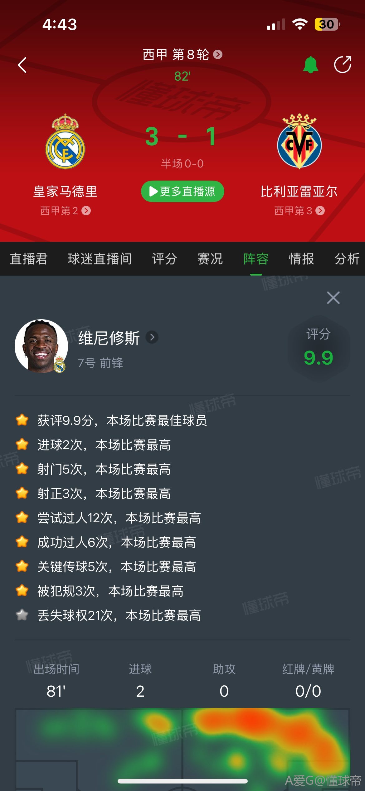 梅开二度,维尼修斯当选皇马vs比利亚雷亚尔全场最佳