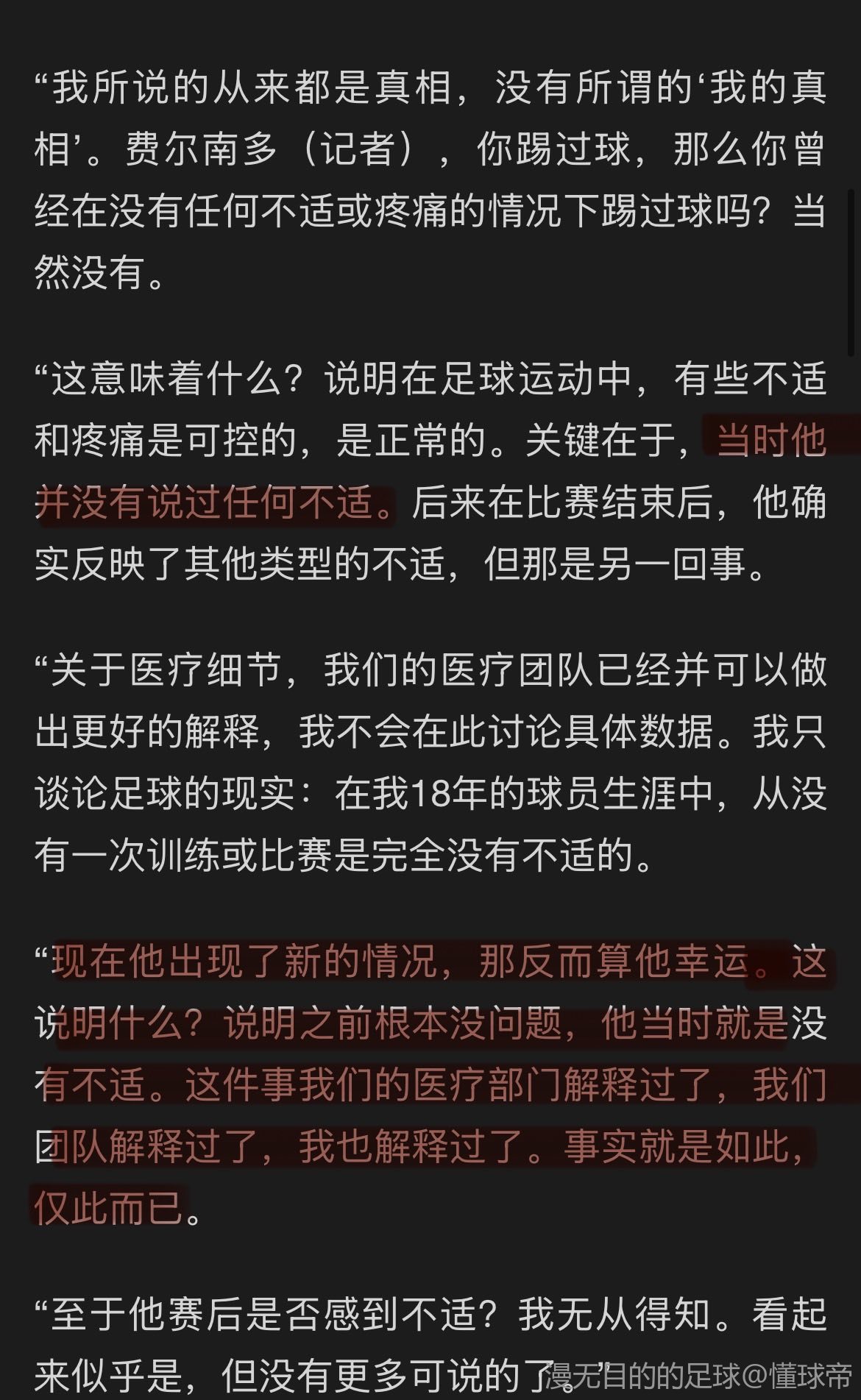 我对我说过的话并不后悔。我想保护我的球员,那是我表达“我们需要停止这样使用球员”的方式。那是我当时的处理方式。但都已经过去了。现在必须专注于当下和未来。那已经是过去的事了。重要的是共同管理局势:俱乐部、国家队……