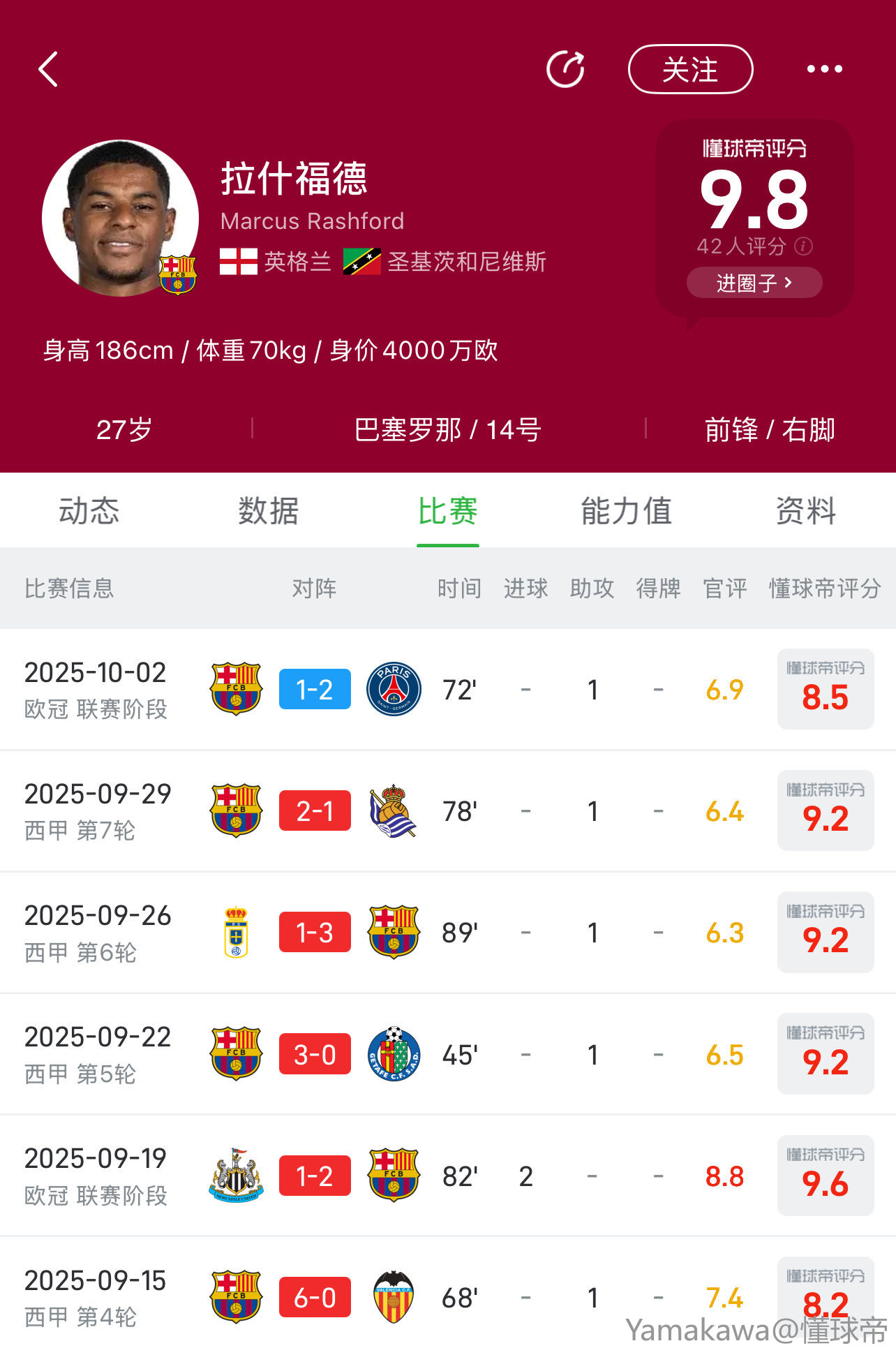 懂球帝首页>动态> 斩获西甲首球,拉什福德在巴萨已连续7场比赛参与进球