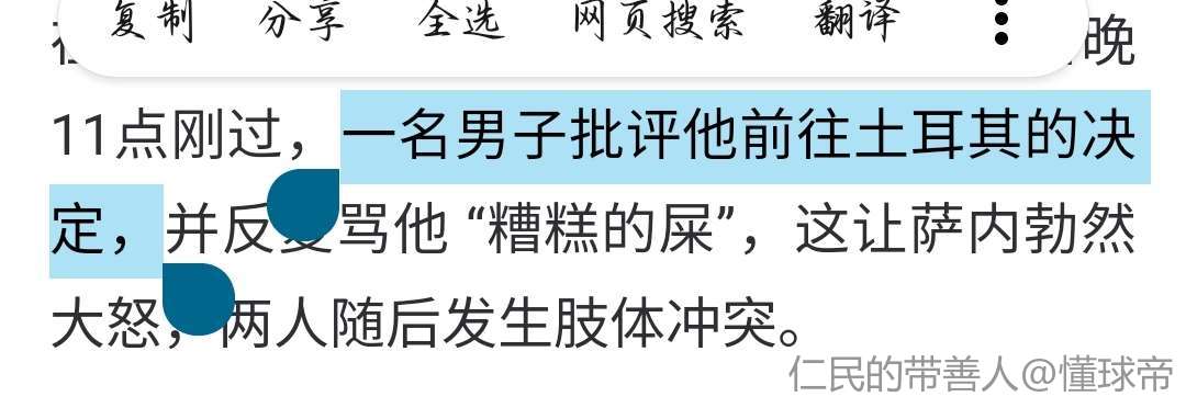 “当晚11点刚过,一名男子批评他前往土耳其的决定,并反复骂他 “糟糕的屎”,这让萨内勃然大怒,两人随后发生肢体冲突。”