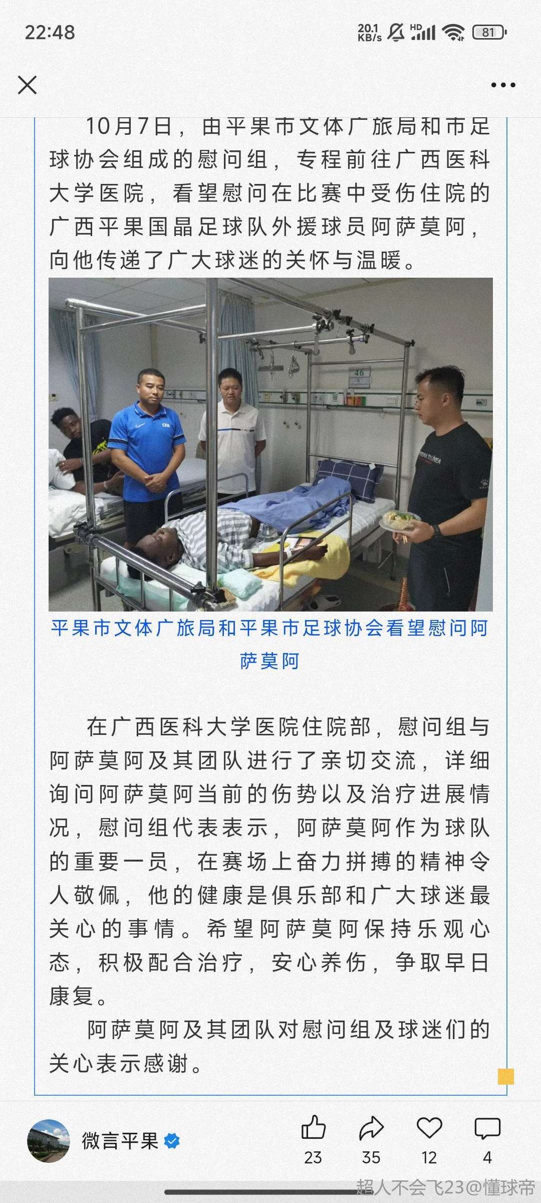 冷知识:根据ins上显示的IP地址依旧还在南宁,你总不能让一个伤者连夜飞去北京吧,而且前几天有些人已经在ins和阿萨莫阿聊过了,阿萨莫啊声称,未来几个月,他都会在南宁接受治疗,并且他从来没说过他恢复的很快,只是说,希望球员不要为他而担心太久,还祝上帝保佑他