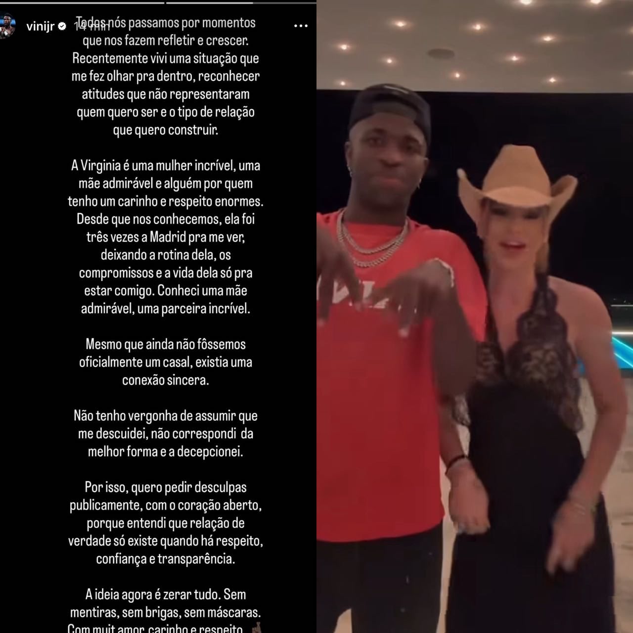 在对话的某一时刻,这位模特对前往西班牙与球员见面的旅行中出现的问题表示失望。尽管维尼修斯当时已有维尔吉妮娅,他仍道歉并表示自己不是小孩子,同时承认与这位模特的暧昧开端确实有些混乱。