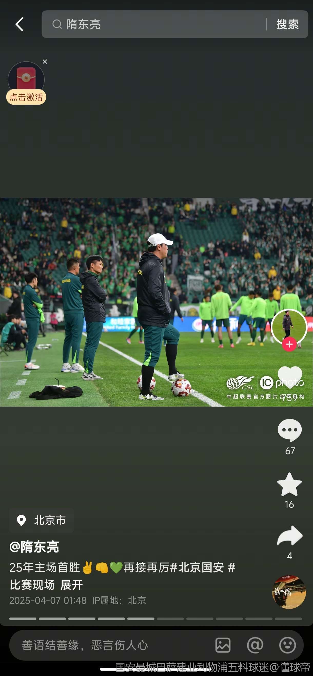 特瓦斯俺给你介绍介绍俺们国安助教 一如既往地装备齐全 在看台上真以为教练组里站个门将 中超教练组唯一一个穿训练服还套个球袜的助教 双层保暖 大热天还整个球袜 说不准还塞着护腿板呢 希望你有一天能执教国足噢
