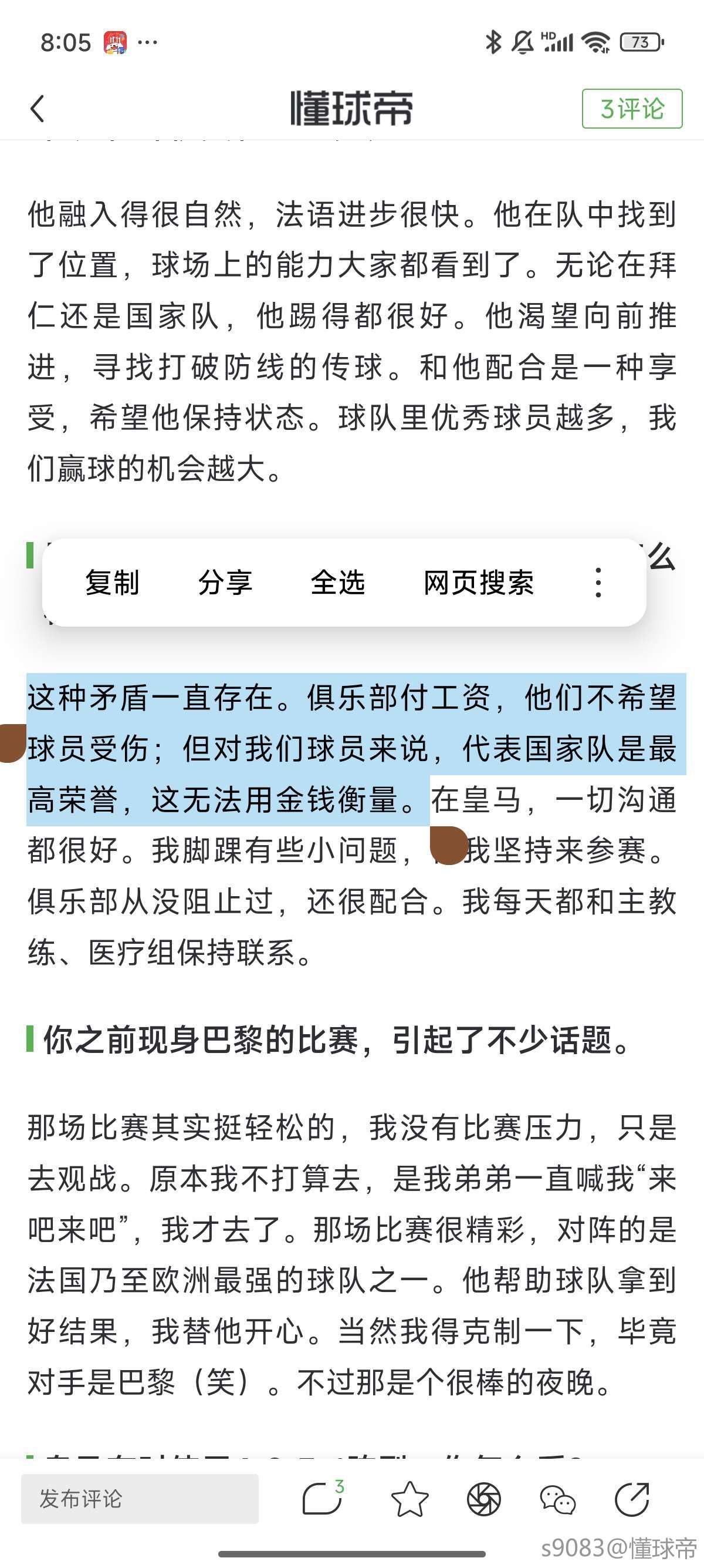 这种矛盾一直存在。俱乐部付工资,他们不希望球员受伤;但对我们球员来说,代表国家队是最高荣誉,这无法用金钱衡量。在皇马,一切沟通都很好。我脚踝有些小问题,但我坚持来参赛。俱乐部从没阻止过,还很配合。我每天都和主教练、医疗组保持联系。