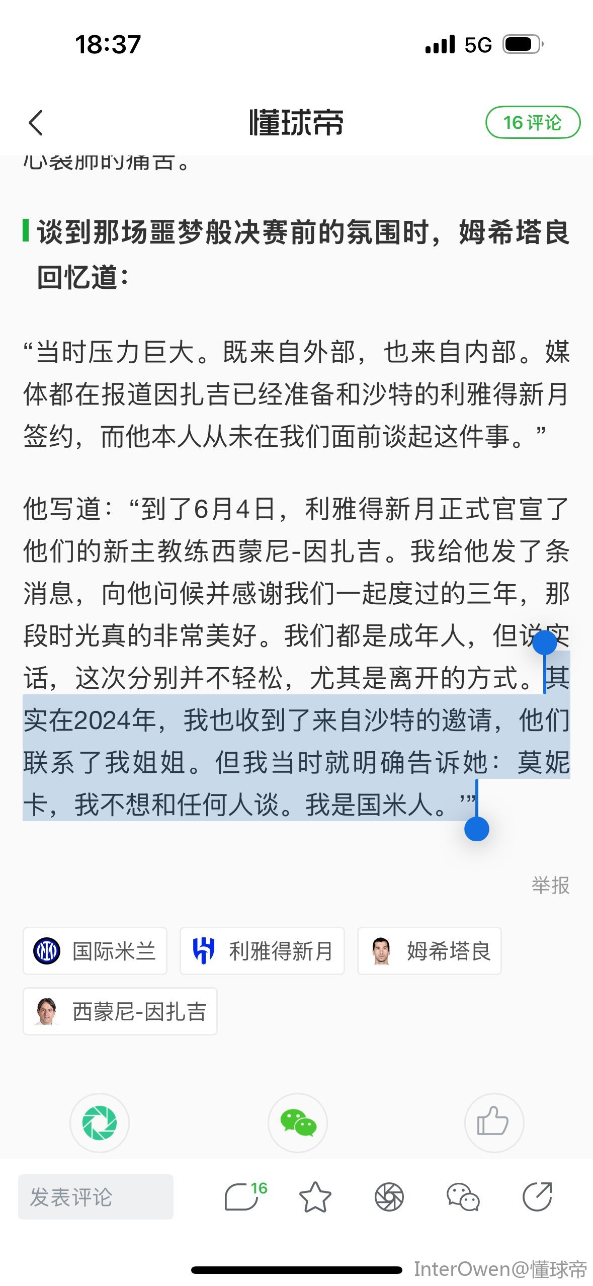 小因赛前肯定是做了去沙特的决定,大赛将来,不想影响军心,不表态。但主要是沙特那边已经开始叽叽歪歪了,一个暴发户,不会考虑其他俱乐部的感受,不停说小因将要到来,其实这样是最坏事的,人最怕就是模棱两可,要不就实话实说,要不就绝对保密,就像鸟一样,小因把国米带进了大家的视野里,但真正拿得出手的就是一个联赛冠军,可以说是丢了两个联赛冠军,最后的结局也是烂尾了,对小因的评价两极分化的很严重,不想鸟一样的统一。
