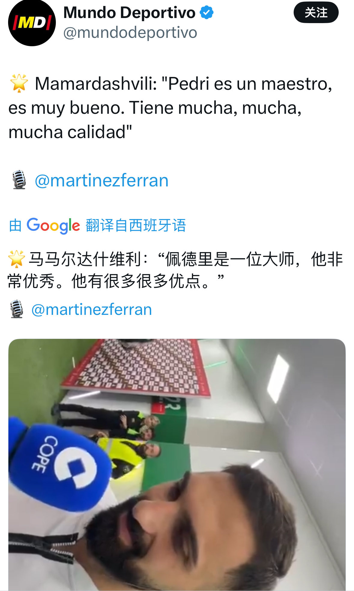 10-12 10:49马马尔达什维利:西班牙太强我啥都做不了;佩德里是大师