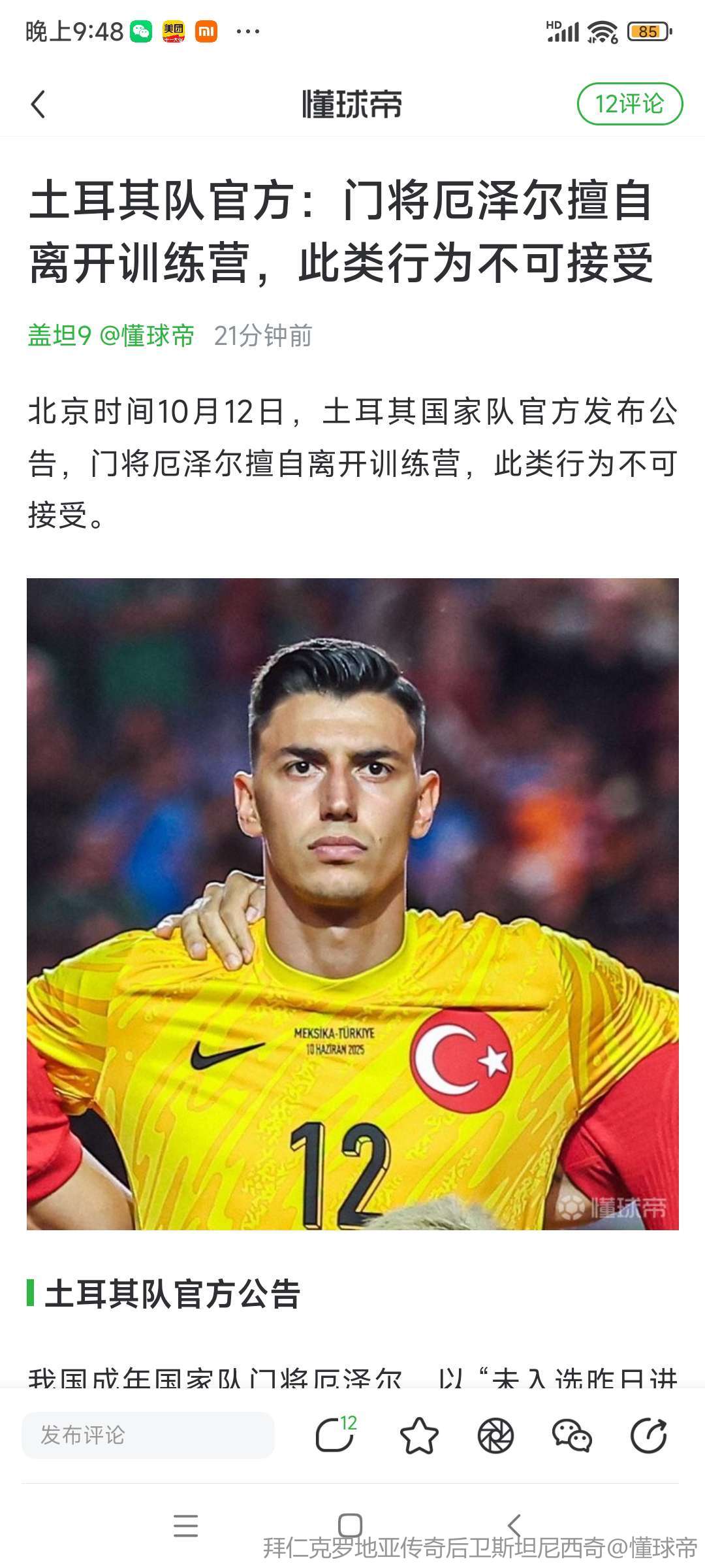 土耳其队官方:门将厄泽尔擅自离开训练营,此类行为不可接受