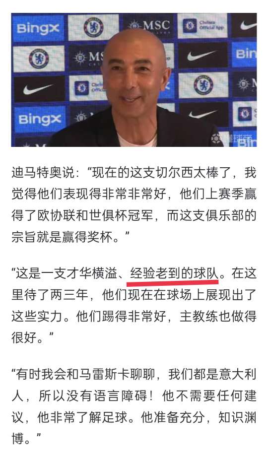 懂球帝首页>动态> 迪马特奥:现在这支切尔西很出色;马雷斯卡了解足球知识渊博