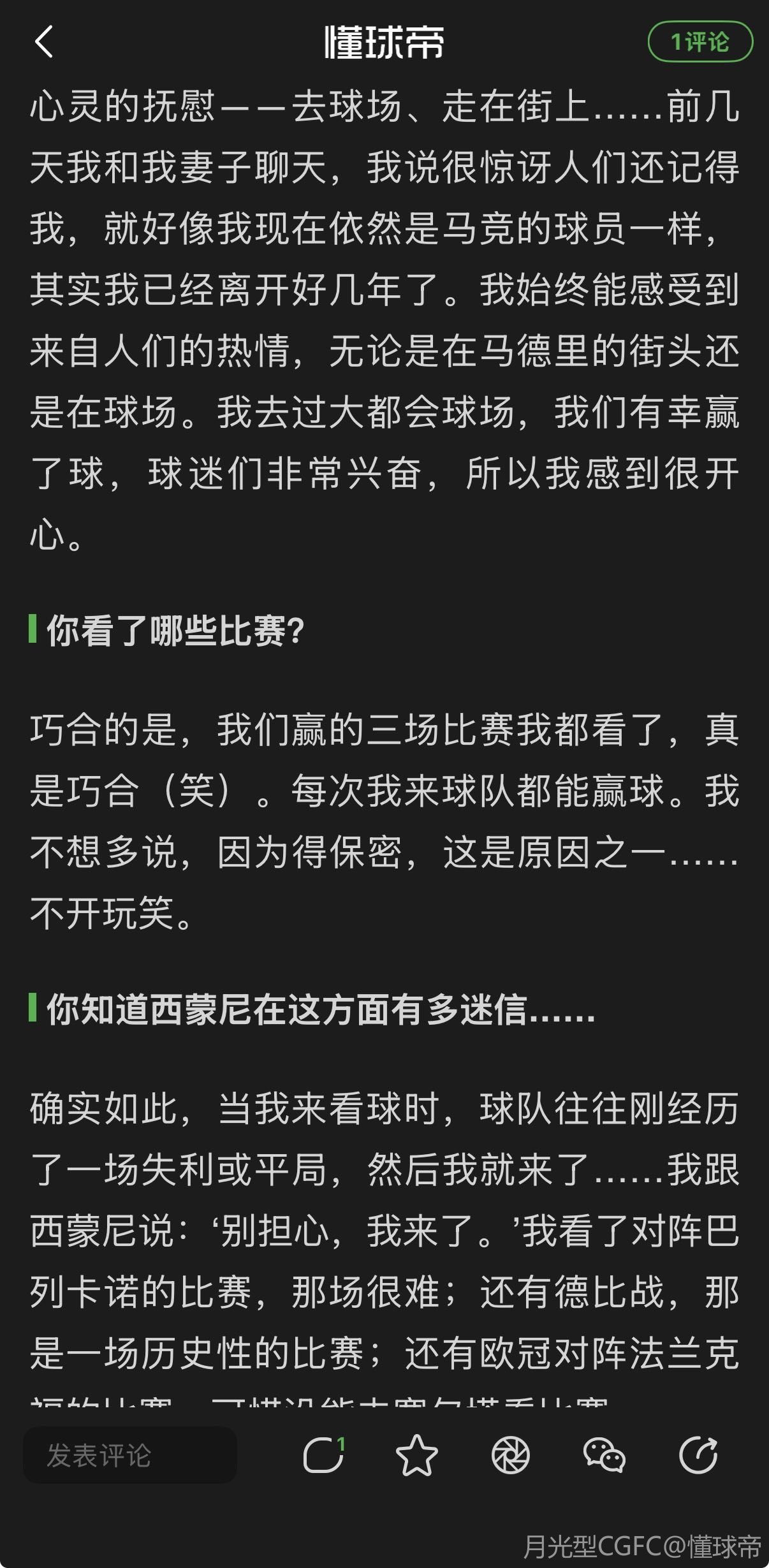 确实如此,当我来看球时,球队往往刚经历了一场失利或平局,然后我就来了……我跟西蒙尼说:‘别担心,我来了。’我看了对阵巴列卡诺的比赛,那场很难;还有德比战,那是一场历史性的比赛;还有欧冠对阵法兰克福的比赛。可惜没能去塞尔塔看比赛。