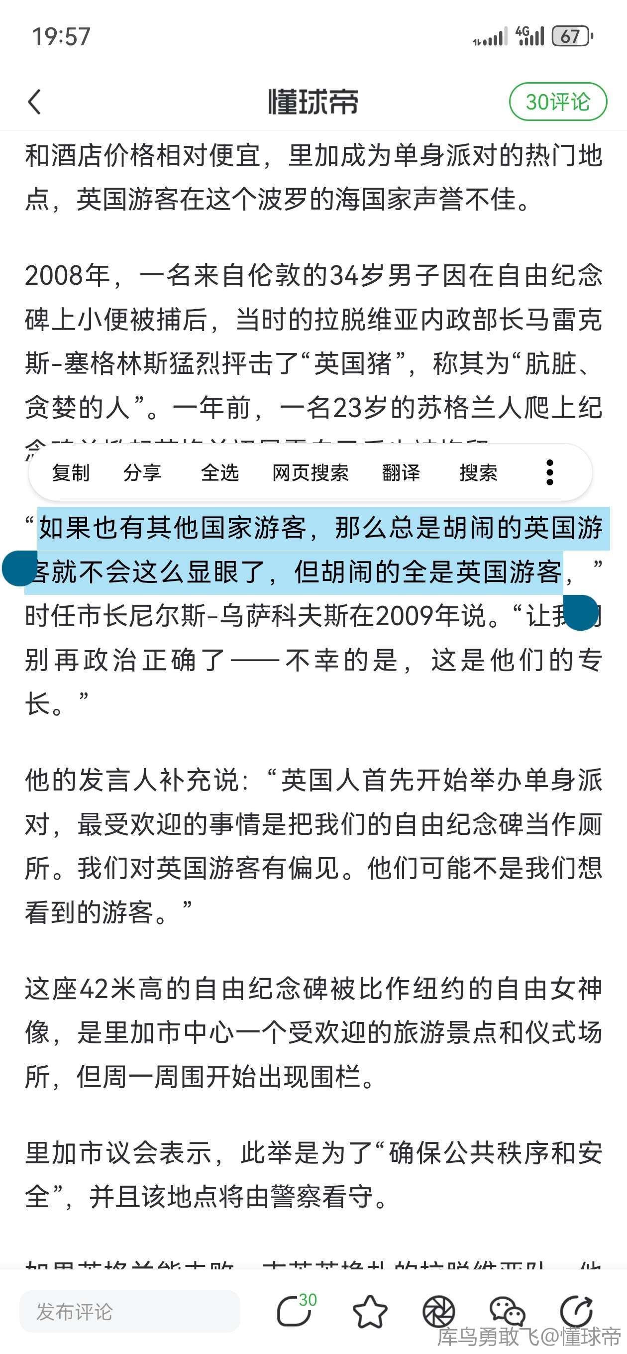 北京时间10月15日,世界杯预选赛欧洲区第一阶段小组赛第8轮,拉脱维亚在主场对阵英格兰,有数千名英格兰球迷远征支持球队。根据《每日邮报》的报道,拉脱维亚最著名的自由纪念碑被围了起来,因为他们担心英格兰球迷可能在纪念碑上小便。