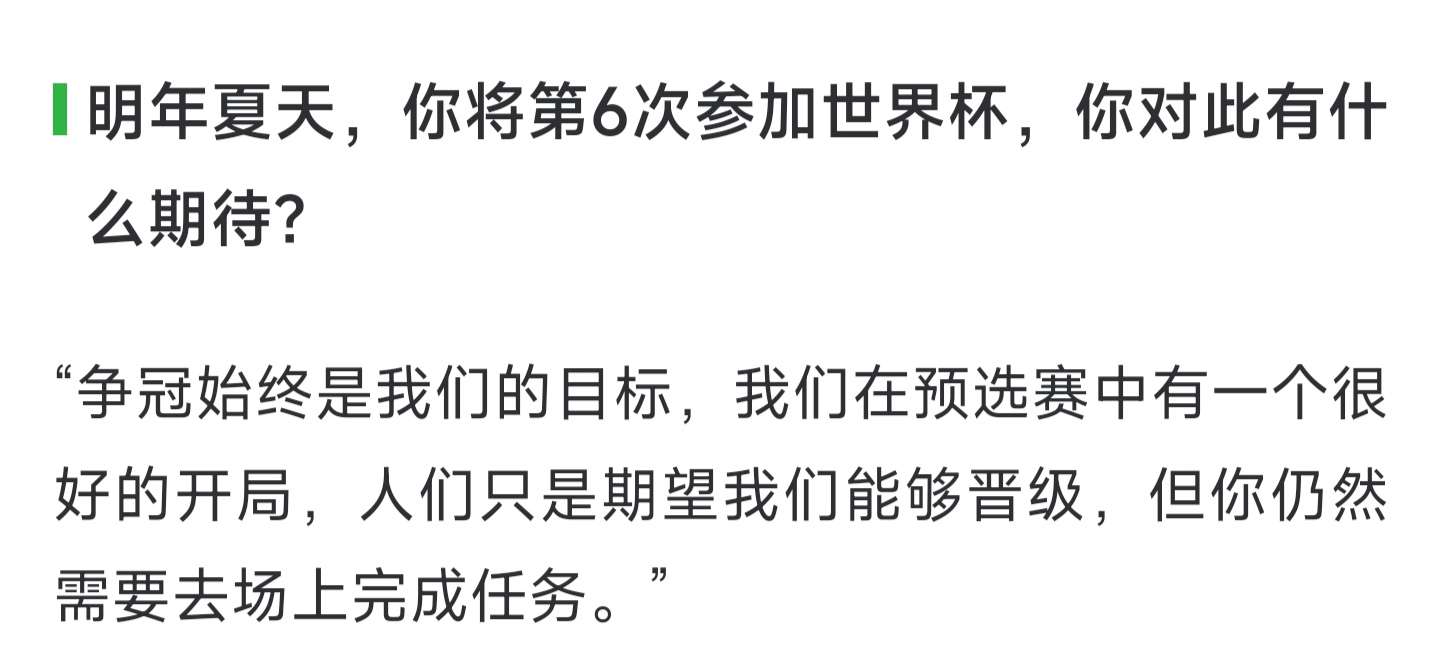 “至于欧冠,虽然还处于初期阶段,但最终还是要争取赢得比赛,而到了世界杯,你当然希望自己能发挥出最佳水平。”