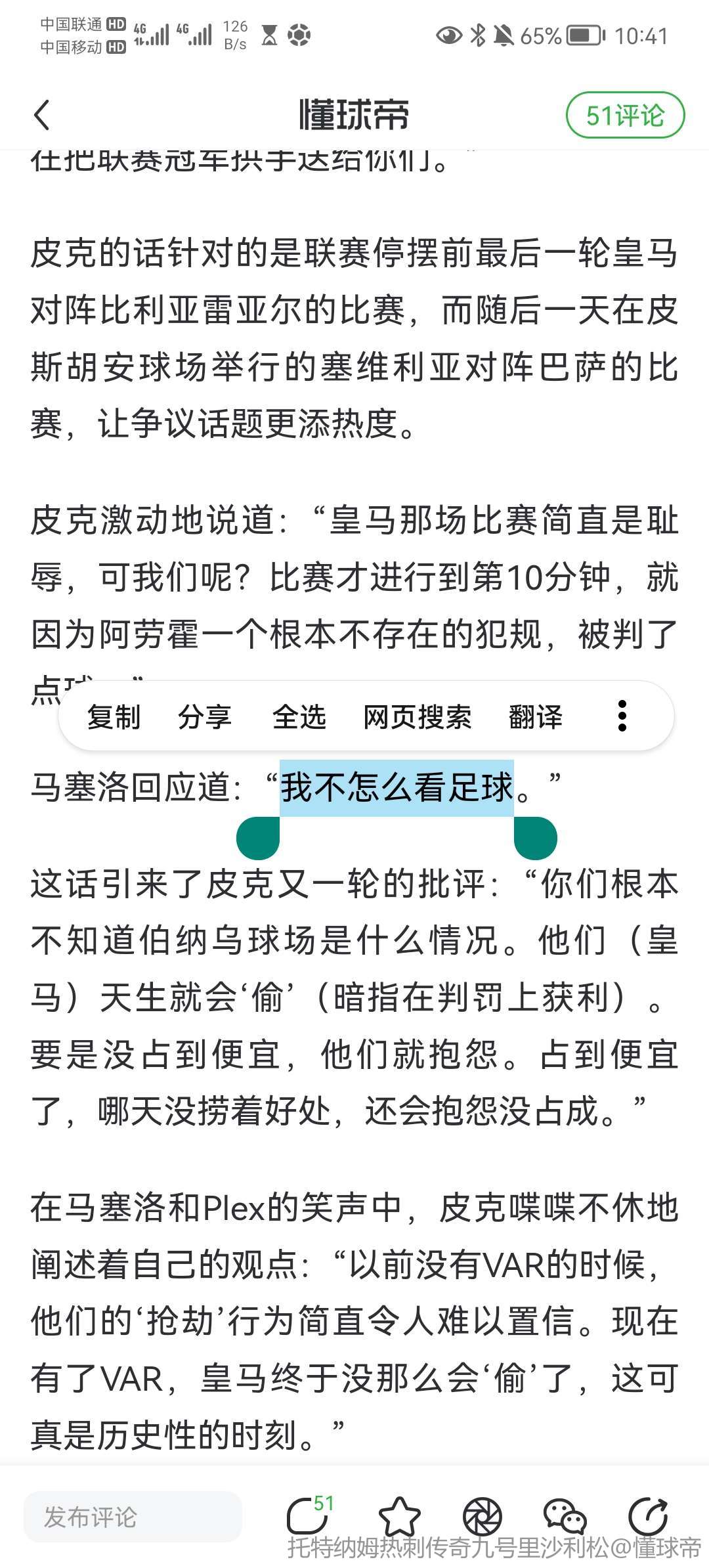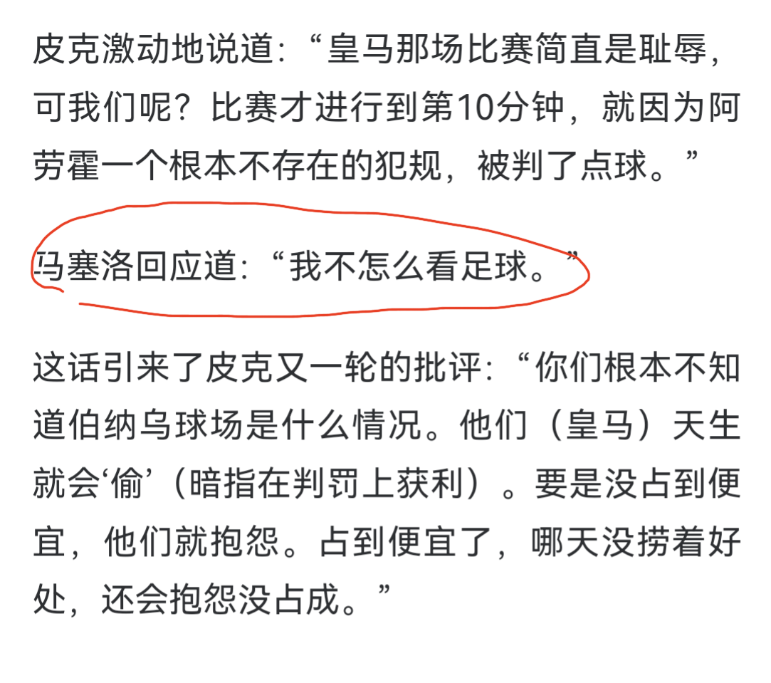 这话引来了皮克又一轮的批评:“你们根本不知道伯纳乌球场是什么情况。他们(皇马)天生就会‘偷’(暗指在判罚上获利)。要是没占到便宜,他们就抱怨。占到便宜了,哪天没捞着好处,还会抱怨没占成。”