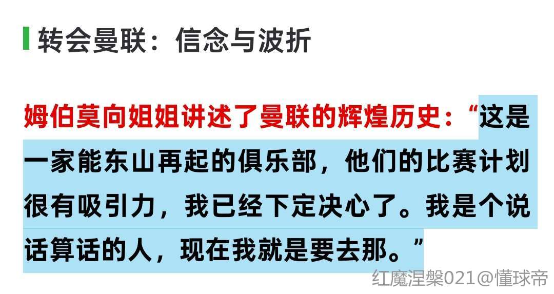 姆伯莫向姐姐讲述了曼联的辉煌历史:“这是一家能东山再起的俱乐部,他们的比赛计划很有吸引力,我已经下定决心了。我是个说话算话的人,现在我就是要去那。”