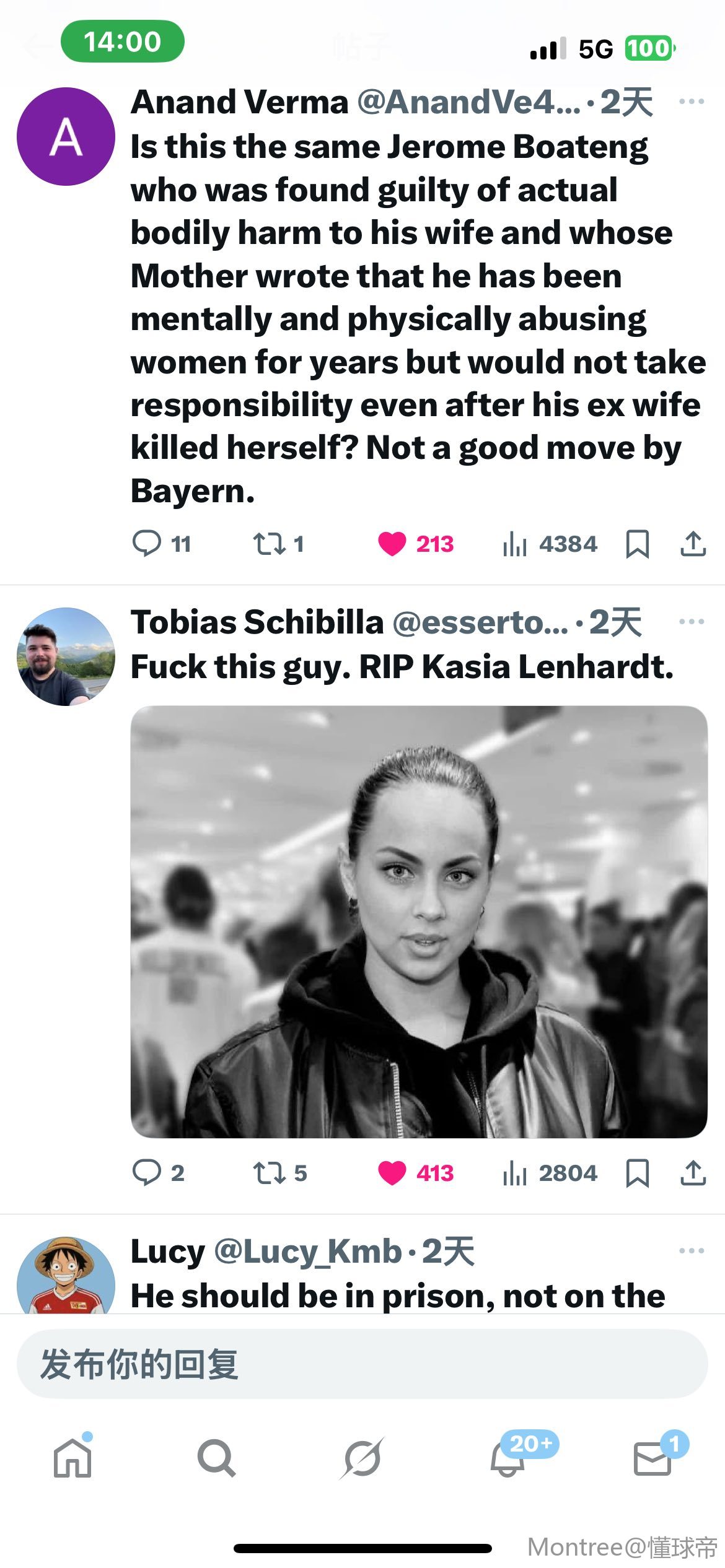 得展开说说这个“家暴前女友”,有两件主要的相关事件…第一件是前女友卡西亚疑似因为博阿滕的家暴和控制行为自杀,虽然法院最后因为关键证人缺席和证据链不完整“疑罪从无,但是博阿滕的哥哥和母亲因此和他决裂…第二件是博阿滕在21年因为被前女友谢琳控诉在18年度假期间遭遇野蛮殴打,被判罚款180万欧…