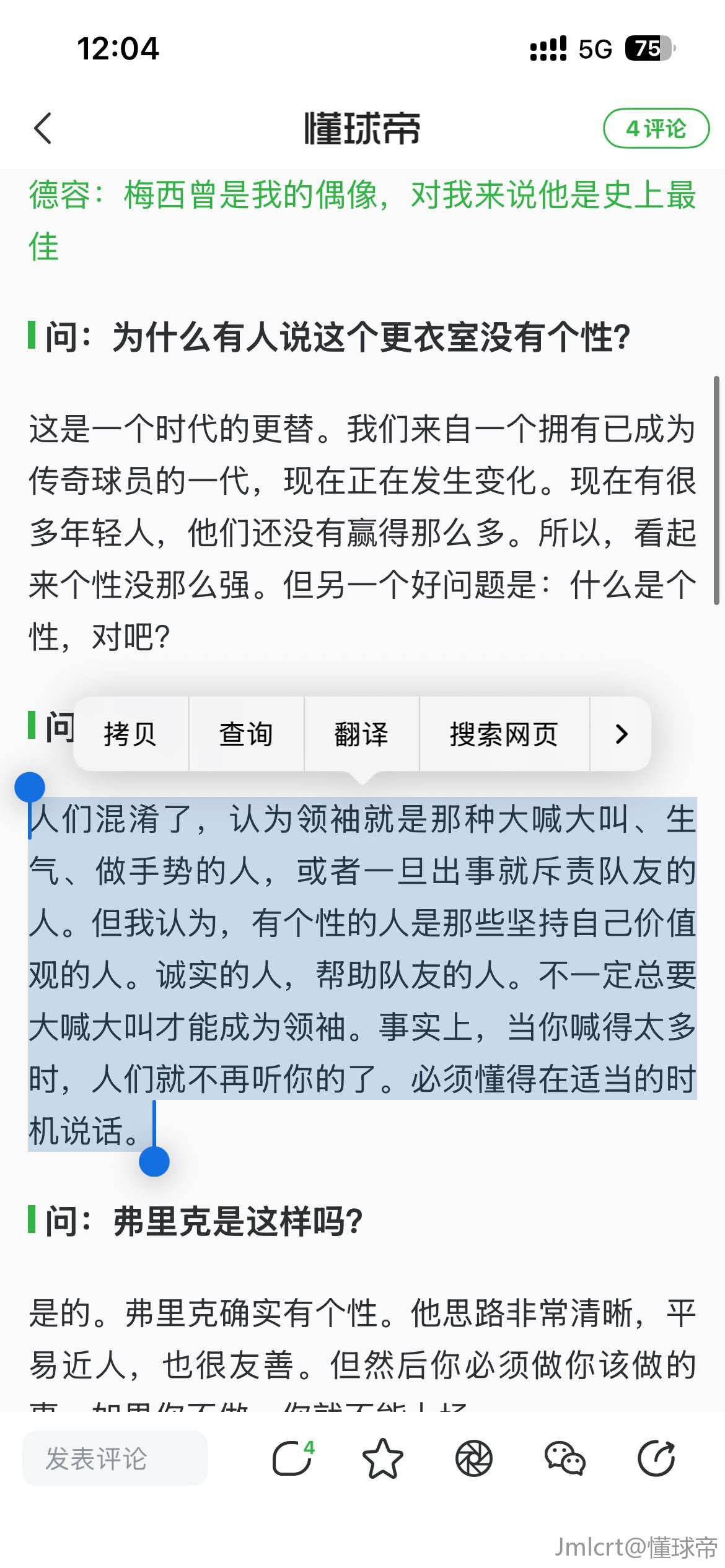 人们混淆了,认为领袖就是那种大喊大叫、生气、做手势的人,或者一旦出事就斥责队友的人。但我认为,有个性的人是那些坚持自己价值观的人。诚实的人,帮助队友的人。不一定总要大喊大叫才能成为领袖。事实上,当你喊得太多时,人们就不再听你的了。必须懂得在适当的时机说话。