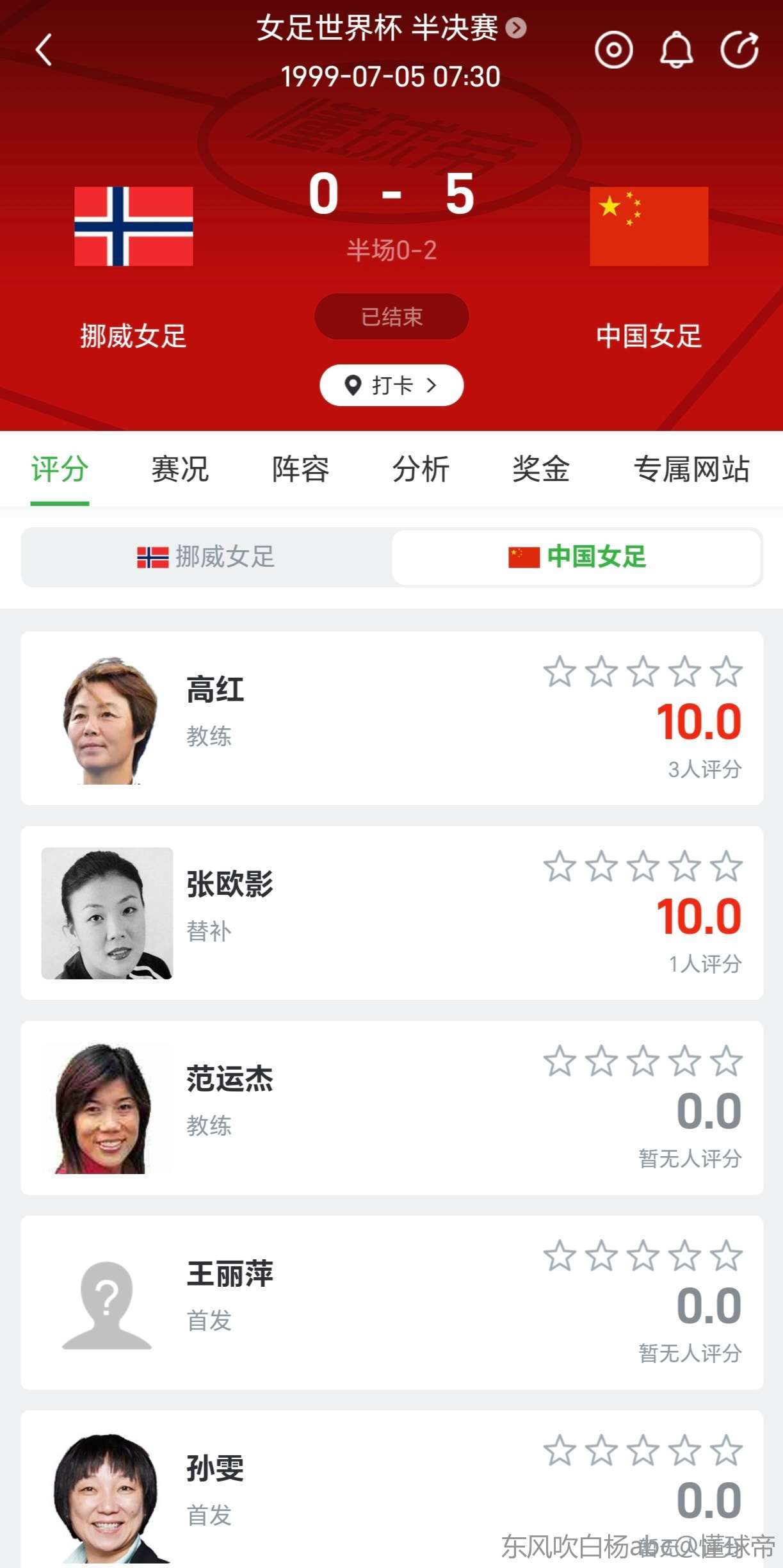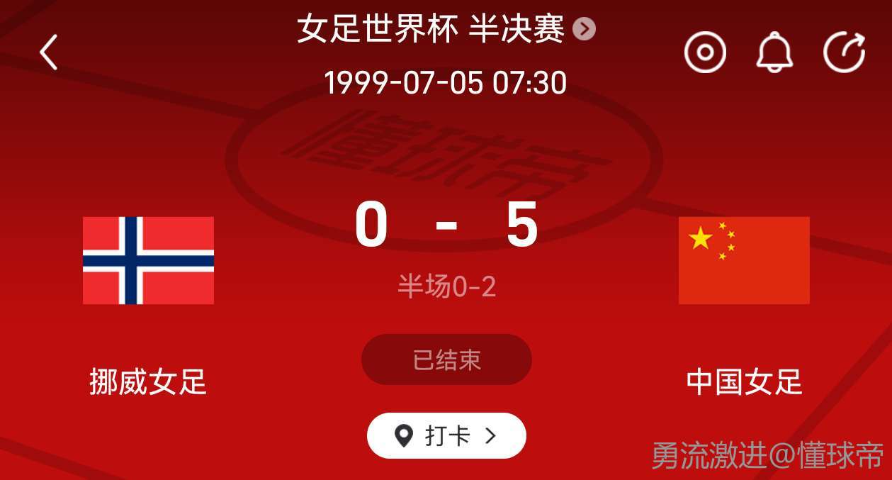 中国女足上次5:0挪威正是1999年女足世界杯的时候