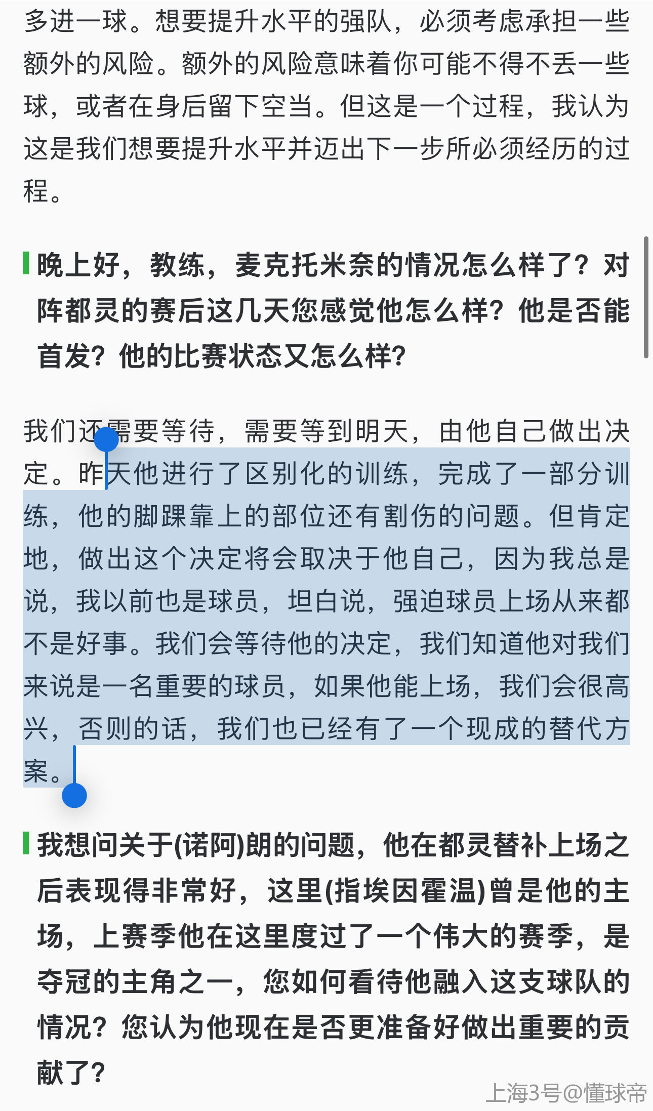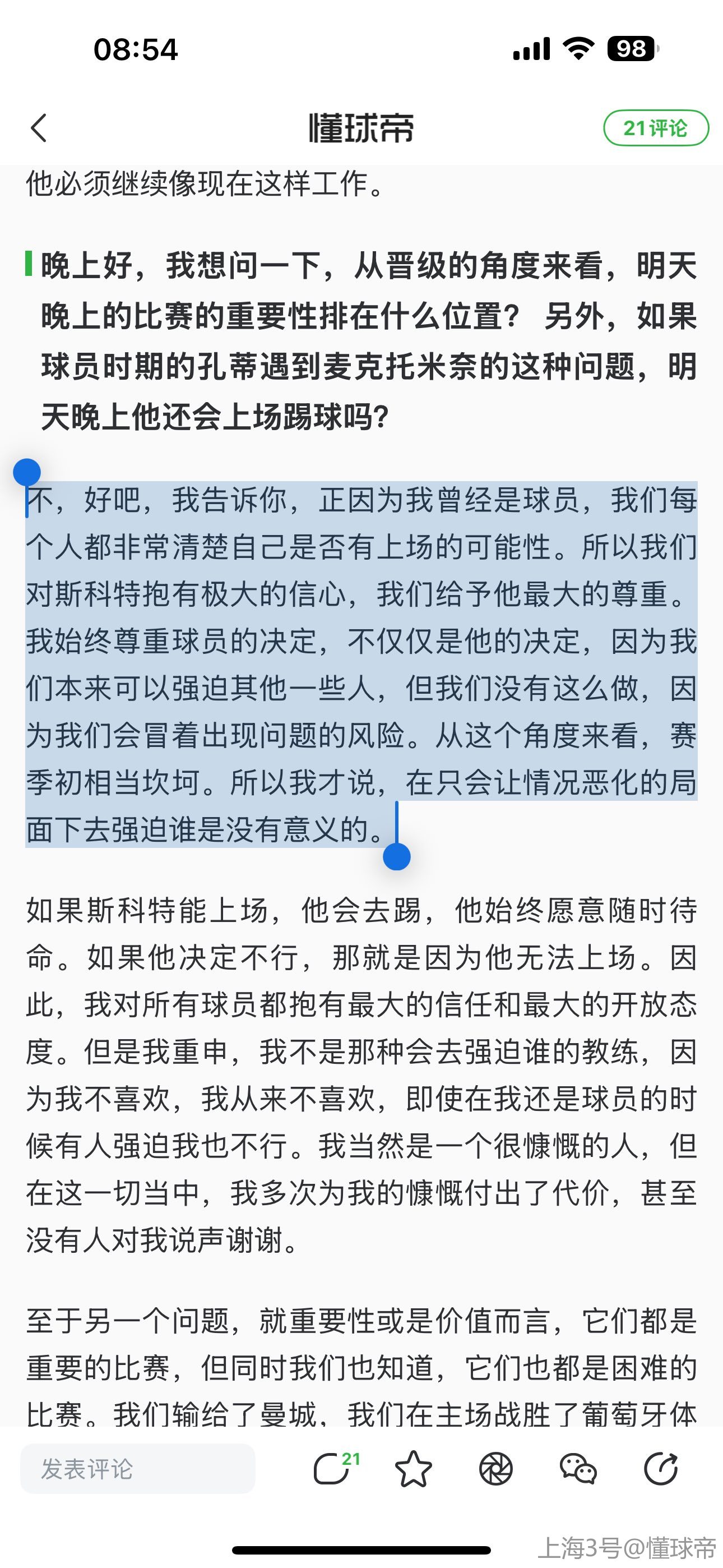 至于另一个问题,就重要性或是价值而言,它们都是重要的比赛,但同时我们也知道,它们也都是困难的比赛。我们输给了曼城,我们在主场战胜了葡萄牙体育,那场比赛里我们几乎就没有上赛季的主力后防线。然而,似乎一切都是理所当然的,一切都被忽视了。但事实并非如此,因为我重申,从赛季初开始,我们就一直在应对重要的情况。我重申,我们将会一如既往地尽力而为,对所有上场的球员都抱有最大的信心。正如我常说的那样,必须有信心、有耐心,不要过度赞扬,也不要一棒子打死谁,这种情况经常发生,但这是不对的,因为这肯定对我们没有帮助。
