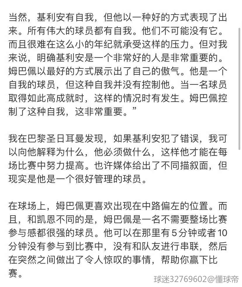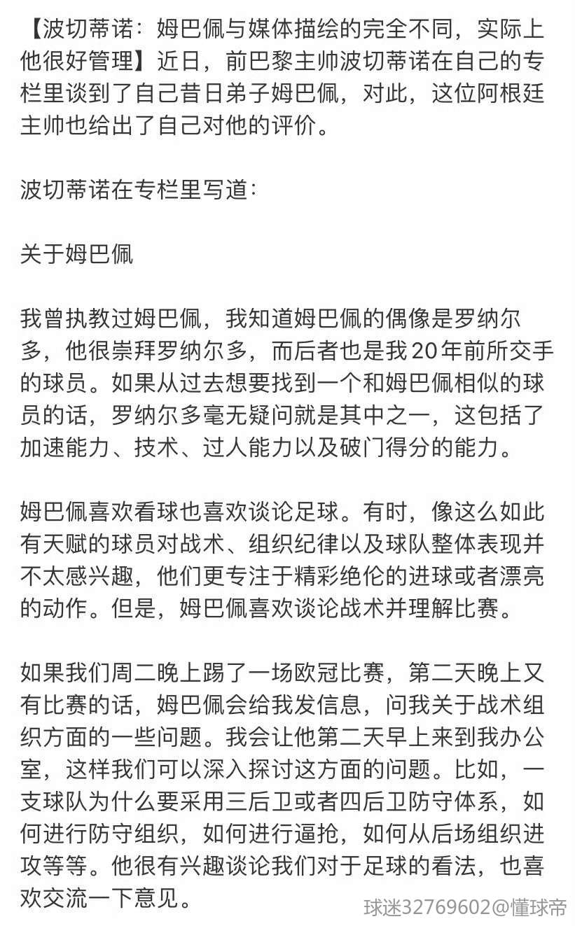我想起波切蒂诺之前也发表过类似的言论。感觉巴佩是喜欢足球、爱研究足球、讨论足球的,做他的教练你不能只发布命令让他遵照执行,而是要说服他相信你的战术。