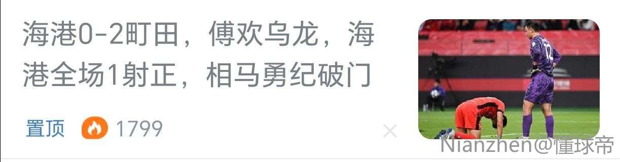 海港0-2町田,傅欢乌龙,海港全场1射正,相马勇纪破门