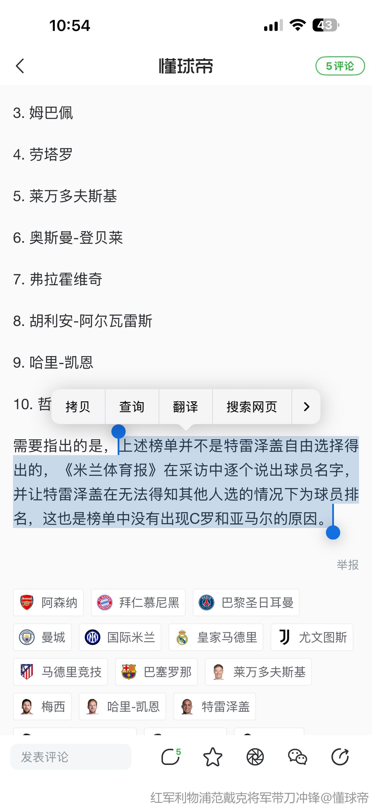 需要指出的是,上述榜单并不是特雷泽盖自由选择得出的,《米兰体育报》在采访中逐个说出球员名字,并让特雷泽盖在无法得知其他人选的情况下为球员排名,这也是榜单中没有出现C罗和亚马尔的原因。