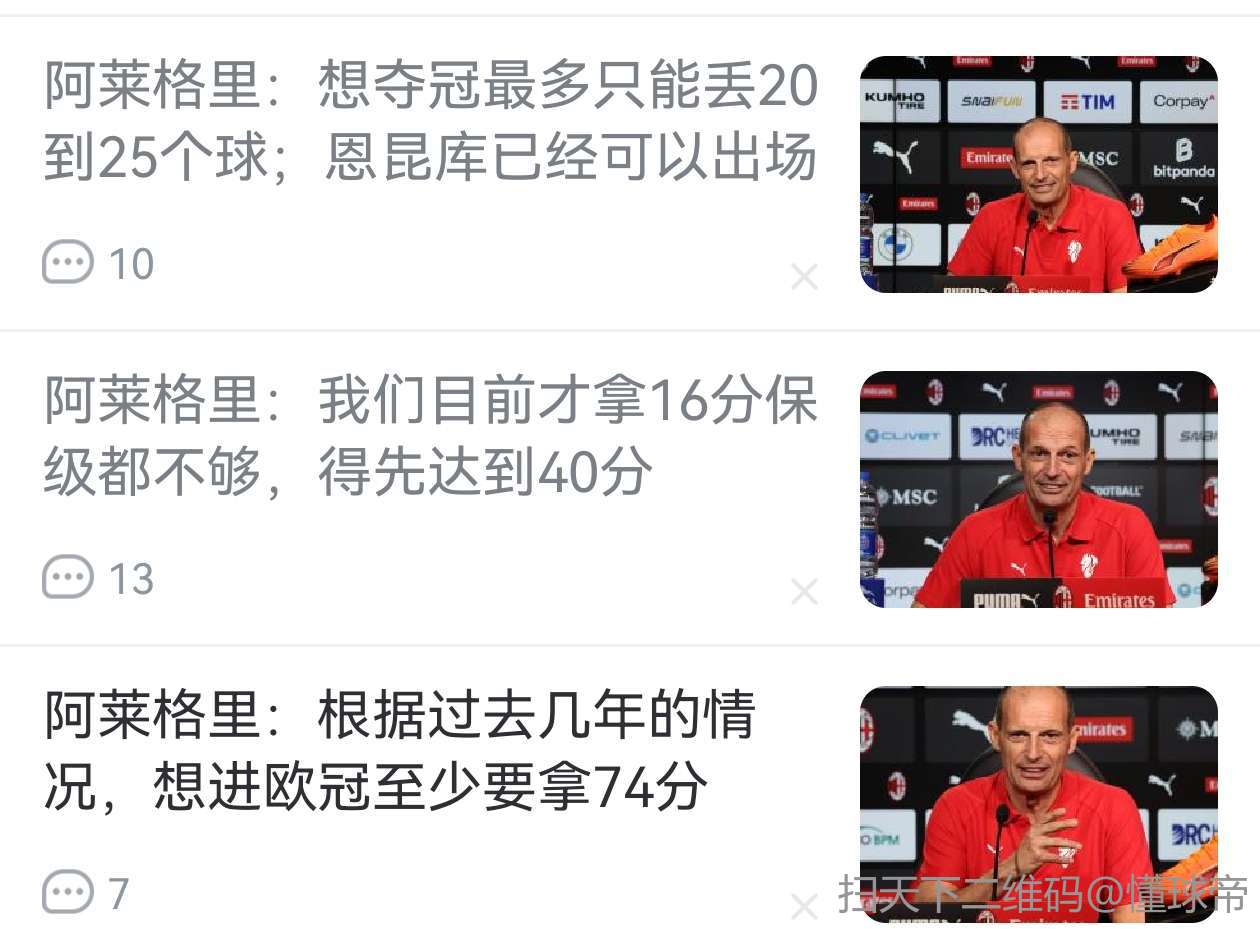 【阿莱格里:想夺冠最多只能丢20到25个球;恩昆库已经可以出场】