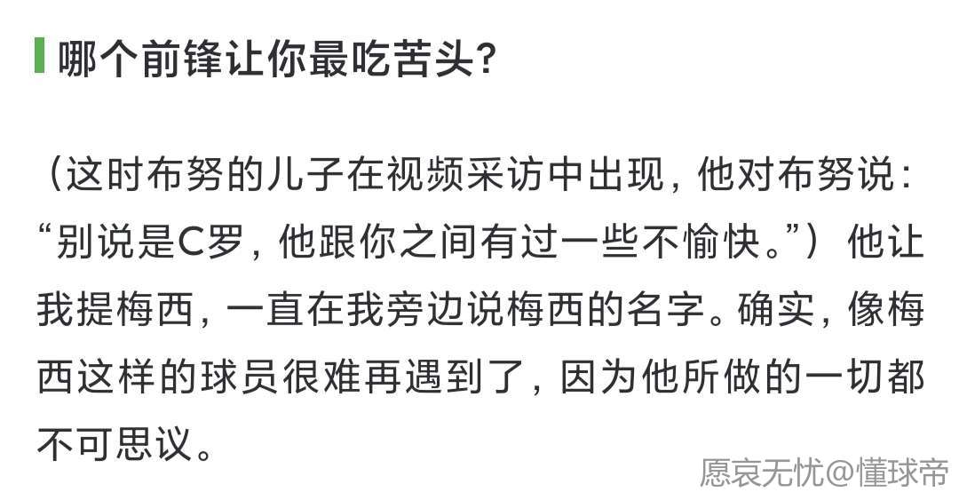 (这时布努的儿子在视频采访中出现,他对布努说:“别说是C罗,他跟你之间有过一些不愉快。”) 他让我提梅西,一直在我旁边说梅西的名字。确实,像梅西这样的球员很难再遇到了,因为他所做的一切都不可思议。