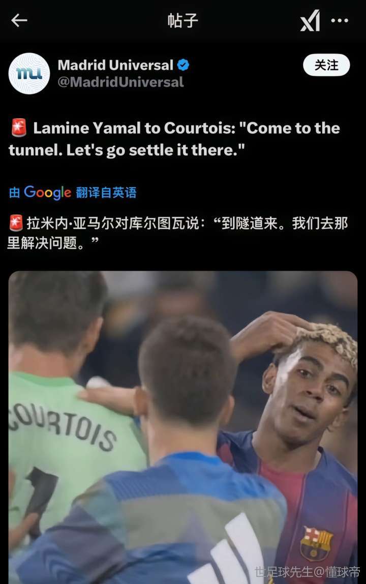 当亚马尔感觉自己有了保护之后,便在远处对皇马球员说“有种出去单挑”。