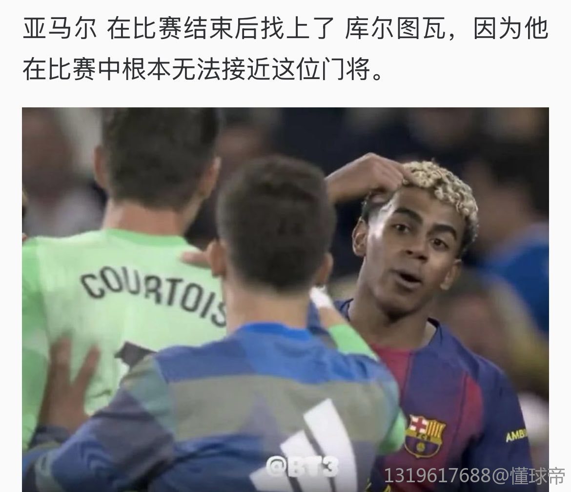 在周日比赛开始前,亚马尔在皮克的国王联赛直播中开玩笑称皇马是“爱抱怨的人和小偷”,随后,在比赛前夕,他在个人社媒上发布了一张照片,显示上赛季西甲交锋中他在伯纳乌进球后愤怒的皇马球迷对他进行嘲讽的画面。