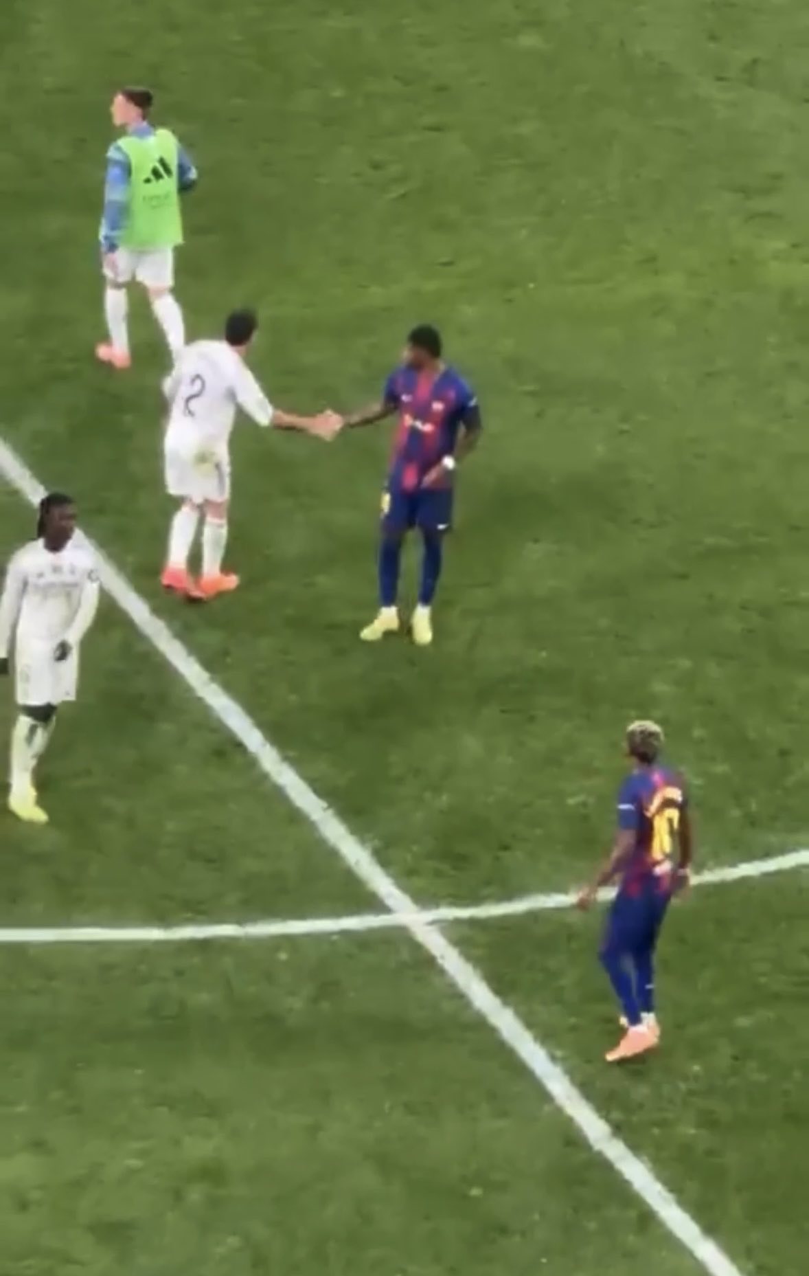比赛结束后,在中场附近,皇马队长卡瓦哈尔走向亚马尔,用手势示意他认为亚马尔话太多了。拉什福德随后走过来与卡瓦哈尔握手,但后者转身离开。亚马尔试图跑向他的西班牙国家队队友卡瓦哈尔,但皇马的卡马文加以身阻挡。