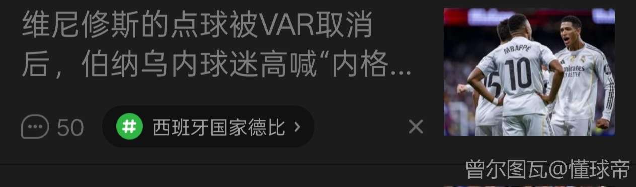 裁判判罚争议主导了最近几次的西班牙国家德比,唯一令人意外的是,这次争议来得如此之早。比赛第2分钟,维尼修斯在禁区内被亚马尔放倒,主裁判索托-格拉多在回看VAR后判定亚马尔先碰到球,并取消了点球判罚,伯纳乌球场的球迷们瞬间高喊:“内格雷拉,内格雷拉!” 以及 “足协腐败!”