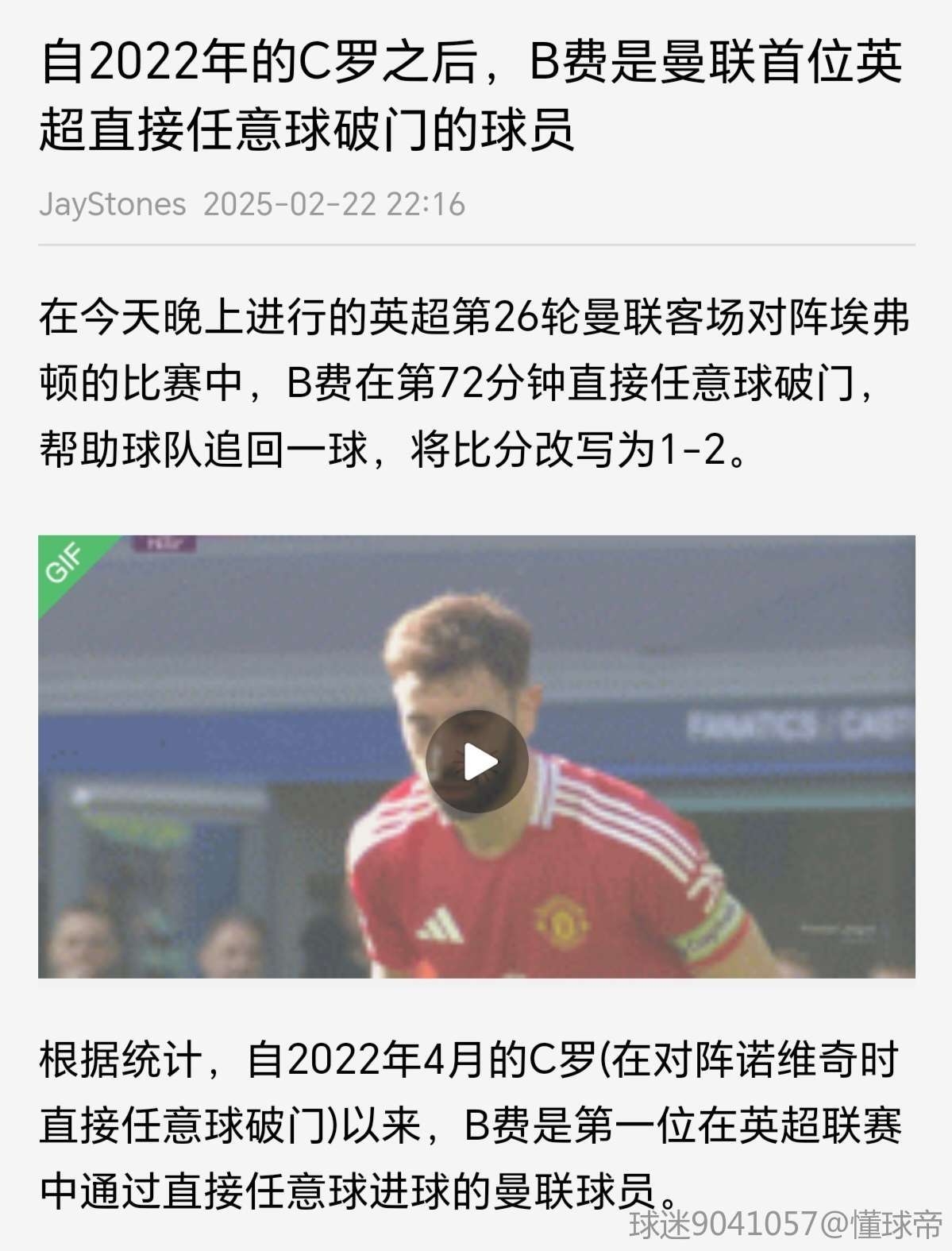 事实是C罗在22年4月为曼联进了任意球后,曼联下一个任意球进球是在25年2月。