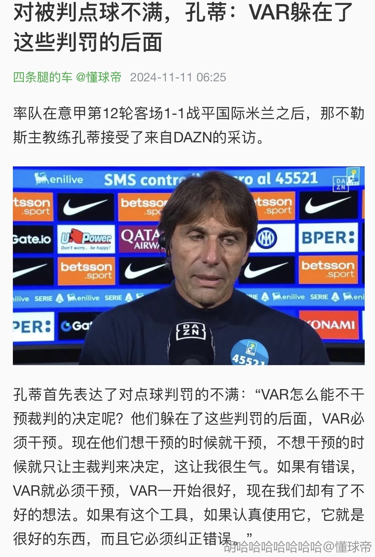 以前从没喷过孔蒂,但这次真的他是真牛b,上赛季国米主场1-1那不勒斯那次,恰尔汉奥卢罚丢的那个点球,他怎么喷的自己是忘了么??