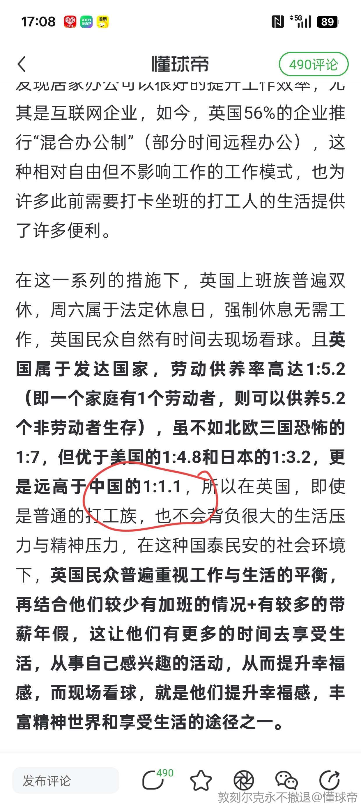 在这一系列的措施下,英国上班族普遍双休,周六属于法定休息日,强制休息无需工作,英国民众自然有时间去现场看球。且英国属于发达国家,劳动供养率高达1:5.2(即一个家庭有1个劳动者,则可以供养5.2个非劳动者生存),虽不如北欧三国恐怖的1:7,但优于美国的1:4.8和日本的1:3.2,更是远高于中国的1:1.1,所以在英国,即使是普通的打工族,也不会背负很大的生活压力与精神压力,在这种国泰民安的社会环境下,英国民众普遍重视工作与生活的平衡,再结合他们较少有加班的情况+有较多的带薪年假,这让他们有更多的时间去享受生活,从事自己感兴趣的活动,从而提升幸福感,而现场看球,就是他们提升幸福感,丰富精神世界和享受生活的途径之一。