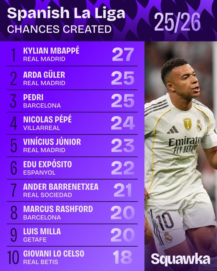 扫描下载懂球帝首页>动态> 本赛季西甲创造机会最多榜:姆巴佩27次,居莱尔佩德里25次第二