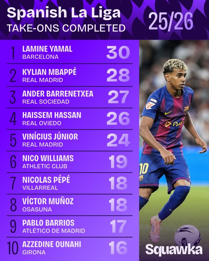 扫描下载懂球帝首页>动态> 本赛季西甲完成过人最多榜:亚马尔30次居首,姆巴佩28次第二