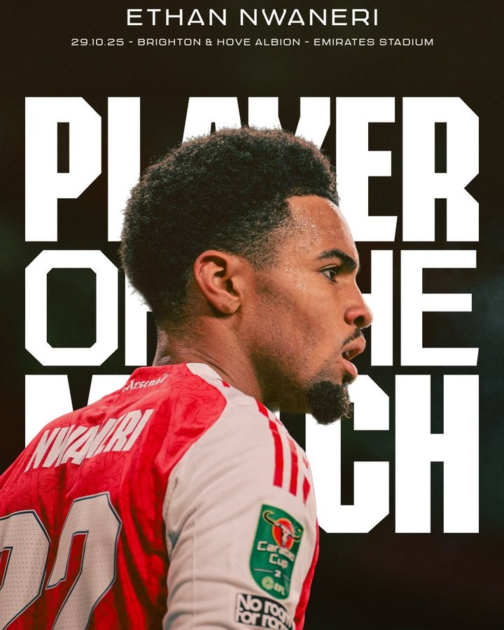 扫描下载懂球帝首页>动态> 打入一球,恩瓦内里当选与布莱顿一役阿森纳队内最佳球员