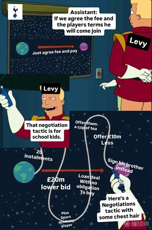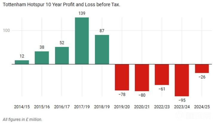 热刺从兴建价值十亿英镑的新球场之时先后以向银行和投行借贷、发放债券的形式筹集了10.5亿欧元(86.69亿人民币)资金。热刺敢于放手一搏,不只是因为那一套青春风暴的欧冠亚军班底,更是因为2018-2019赛季前连年的盈利数据。而后来的情况却急转直下,球队连续五年持续亏损。随着英超争六争四格局变得愈发激烈,成绩下滑会拖垮球队的良性运转,欧战分成会下降,观众上座会减少,球衣销售收入会损失。更何况球队还要承担一次次换帅的违约金和翻新阵容的沉默成本。而这会一次次地暴露列维的缺点,即在出售那些非核心球员时,列维的拖延战术并不奏效,只会让球员在合同最后阶段被低价卖出。