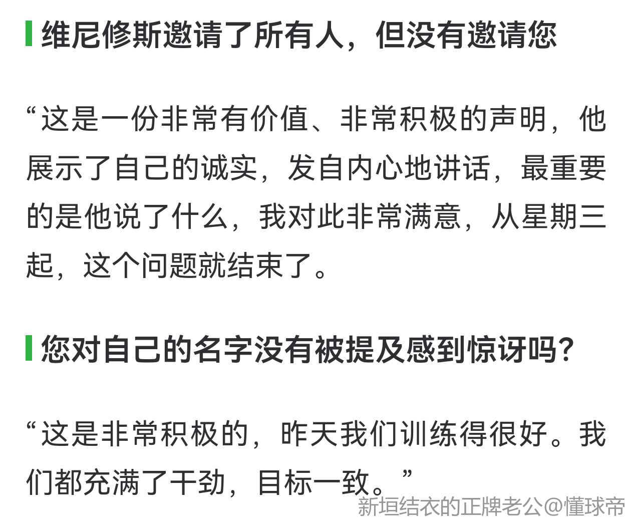 这维尼不是当众下教练面子吗 什么给全队不给教练道歉 当教练是什么? 也就是赢了球舆论没那么大 阿隆索也太软了 这都不惩罚来立威 以后个个都可以踩你头上 更难管理更衣室